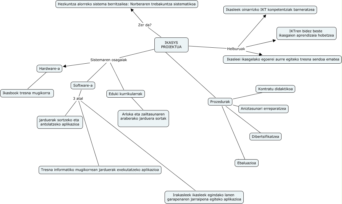 Este Cmap, tiene información relacionada con: Idoia, Eduki kurrikularrak Arloka eta zailtasunaren araberako jarduera sortak, IKASYS PROIEKTUA ???? Prozedurak, Software-a 3 atal Irakasleek ikasleek egindako lanen garapenaren jarraipena egiteko aplikazioa, IKASYS PROIEKTUA Sistemaren osagaiak Eduki kurrikularrak, Hardware-a Ikasbook tresna mugikorra, IKASYS PROIEKTUA Helburuak Ikasleei ikasgelako egoerei aurre egiteko tresna sendoa ematea, Prozedurak ???? Dibertsifikatzea, IKASYS PROIEKTUA Sistemaren osagaiak Software-a, Prozedurak ???? Kontratu didaktikoa, IKASYS PROIEKTUA Helburuak IKTren bidez beste ikasgaien aprendizaia hobetzea, IKASYS PROIEKTUA Sistemaren osagaiak Hardware-a, Prozedurak ???? Aniztasunari erreparatzea, Prozedurak ???? Ebaluazioa, IKASYS PROIEKTUA Zer da? Hezkuntza alorreko sistema berritzailea: Norberaren trebakuntza sistematikoa, Software-a 3 atal jarduerak sortzeko eta antolatzeko aplikazioa, IKASYS PROIEKTUA Helburuak Ikasleek oinarrizko IKT konpetentziak barneratzea, Software-a 3 atal Tresna informatiko mugikorrean jarduerak exekutatzeko aplikazioa