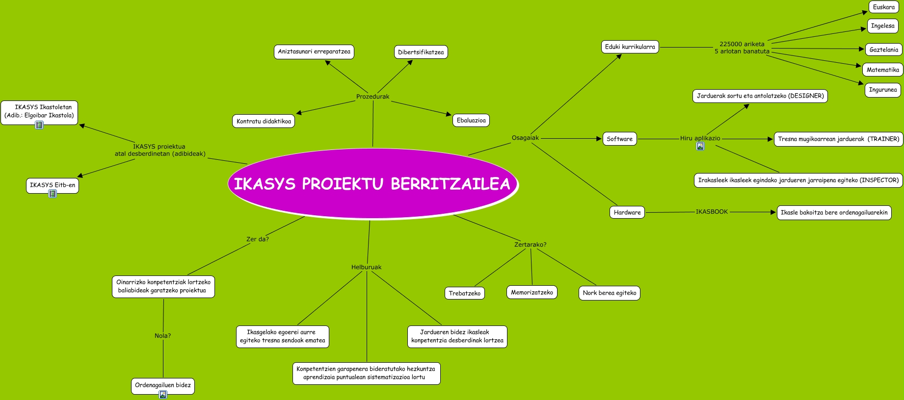 Este Cmap, tiene información relacionada con: MAPA KONTZEPTUALA IKERNE, IKASYS PROIEKTU BERRITZAILEA Zertarako? Nork berea egiteko, IKASYS PROIEKTU BERRITZAILEA IKASYS proiektua atal desberdinetan (adibideak) IKASYS Ikastoletan (Adib.: Elgoibar Ikastola), IKASYS PROIEKTU BERRITZAILEA Prozedurak Ebaluazioa, Software Hiru aplikazio Jarduerak sortu eta antolatzeko (DESIGNER), Eduki kurrikularra 225000 ariketa 5 arlotan banatuta Matematika, IKASYS PROIEKTU BERRITZAILEA Helburuak Ikasgelako egoerei aurre egiteko tresna sendoak ematea, IKASYS PROIEKTU BERRITZAILEA Osagaiak Eduki kurrikularra, IKASYS PROIEKTU BERRITZAILEA Zertarako? Memorizatzeko, Oinarrizko konpetentziak lortzeko baliabideak garatzeko proiektua Nola? Ordenagailuen bidez, IKASYS PROIEKTU BERRITZAILEA Helburuak Jardueren bidez ikasleak konpetentzia desberdinak lortzea, Hardware IKASBOOK Ikasle bakoitza bere ordenagailuarekin, Eduki kurrikularra 225000 ariketa 5 arlotan banatuta Ingelesa, Eduki kurrikularra 225000 ariketa 5 arlotan banatuta Euskara, IKASYS PROIEKTU BERRITZAILEA Helburuak Konpetentzien garapenera bideratutako hezkuntza aprendizaia puntualean sistematizazioa lortu, Eduki kurrikularra 225000 ariketa 5 arlotan banatuta Ingurunea, IKASYS PROIEKTU BERRITZAILEA Osagaiak Software, Eduki kurrikularra 225000 ariketa 5 arlotan banatuta Gaztelania, IKASYS PROIEKTU BERRITZAILEA IKASYS proiektua atal desberdinetan (adibideak) IKASYS Eitb-en, IKASYS PROIEKTU BERRITZAILEA Prozedurak Dibertsifikatzea, IKASYS PROIEKTU BERRITZAILEA Osagaiak Hardware