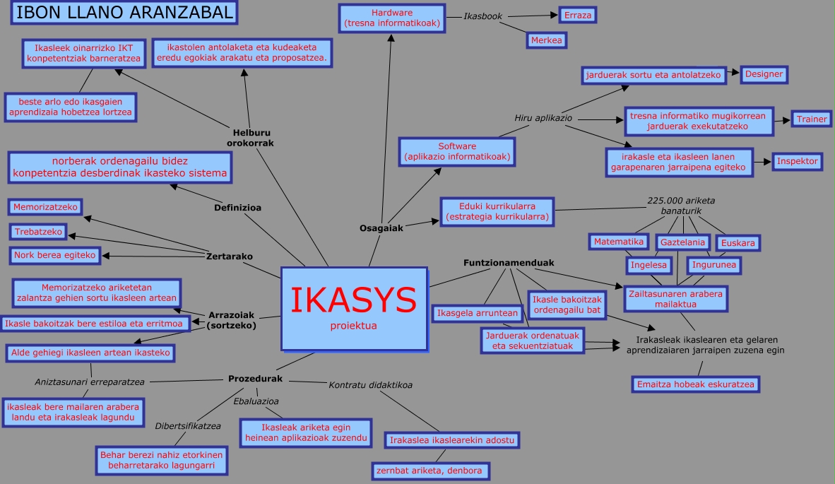 Este Cmap, tiene información relacionada con: ikasys ibon llano, IKASYS proiektua Zertarako Nork berea egiteko, tresna informatiko mugikorrean jarduerak exekutatzeko ???? Trainer, IKASYS proiektua Arrazoiak (sortzeko) Ikasle bakoitzak bere estiloa eta erritmoa, IKASYS proiektua Funtzionamenduak Jarduerak ordenatuak eta sekuentziatuak, Eduki kurrikularra (estrategia kurrikularra) 225.000 ariketa banaturik Ingelesa, Ikasle bakoitzak ordenagailu bat ???? Irakasleak ikaslearen eta gelaren aprendizaiaren jarraipen zuzena egin, Prozedurak Dibertsifikatzea Behar berezi nahiz etorkinen beharretarako lagungarri, IKASYS proiektua Arrazoiak (sortzeko) Alde gehiegi ikasleen artean ikasteko, Ikasgela arruntean ???? Irakasleak ikaslearen eta gelaren aprendizaiaren jarraipen zuzena egin, Software (aplikazio informatikoak) Hiru aplikazio jarduerak sortu eta antolatzeko, jarduerak sortu eta antolatzeko ???? Designer, IKASYS proiektua Definizioa norberak ordenagailu bidez konpetentzia desberdinak ikasteko sistema, Zailtasunaren arabera mailaktua ???? Gaztelania, Eduki kurrikularra (estrategia kurrikularra) 225.000 ariketa banaturik Euskara, Software (aplikazio informatikoak) Hiru aplikazio tresna informatiko mugikorrean jarduerak exekutatzeko, irakasle eta ikasleen lanen garapenaren jarraipena egiteko ???? Inspektor, IKASYS proiektua Zertarako Memorizatzeko, Alde gehiegi ikasleen artean ikasteko Aniztasunari erreparatzea ikasleak bere mailaren arabera landu eta irakasleak lagundu, IKASYS proiektua ???? Prozedurak, Euskara ???? Zailtasunaren arabera mailaktua