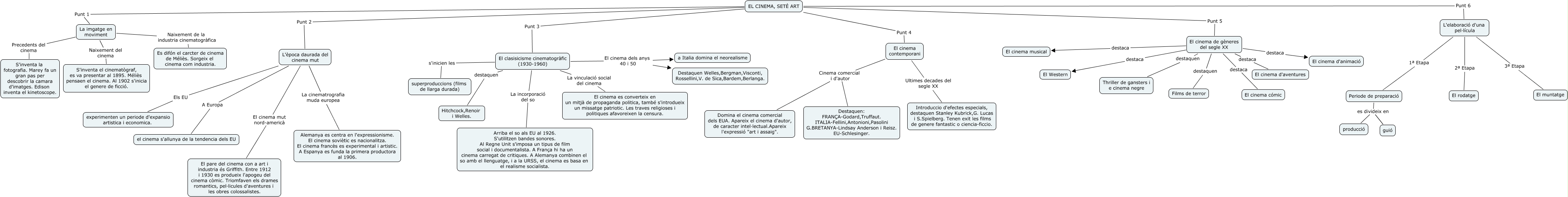 Este Cmap, tiene información relacionada con: SERGI MUÑOZ TEMA 15, El clasisicisme cinematogràfic (1930-1960) La incorporació del so Arriba el so als EU al 1926. S'utilitzen bandes sonores. Al Regne Unit s'imposa un tipus de film social i documentalista. A França hi ha un cinema carregat de critiques. A Alemanya combinen el so amb el llenguatge, i a la URSS, el cinema es basa en el realisme socialista., El cinema de gèneres del segle XX destaca El Western, EL CINEMA, SETÈ ART Punt 3 El clasisicisme cinematogràfic (1930-1960), EL CINEMA, SETÈ ART Punt 4 El cinema contemporani, El cinema contemporani Cinema comercial i d'autor Domina el cinema comercial dels EUA. Apareix el cinema d'autor, de caracter intel·lectual.Apareix l'expressió "art i assaig"., EL CINEMA, SETÈ ART Punt 5 El cinema de gèneres del segle XX, La imgatge en moviment Naixement del cinema S'inventa el cinematògraf, es va presentar al 1895. Méliès pensaen el cinema. Al 1902 s'inicia el genere de ficció., El clasisicisme cinematogràfic (1930-1960) La vinculació social del cinema El cinema es converteix en un mitjà de propaganda politica, també s'introdueix un missatge patriotic. Les traves religioses i politiques afavoreixen la censura., El cinema de gèneres del segle XX destaquen Thriller de gansters i e cinema negre, El clasisicisme cinematogràfic (1930-1960) El cinema dels anys 40 i 50 Destaquen Welles,Bergman,Visconti, Rossellini,V. de Sica,Bardem,Berlanga., guió es divideix en producció, El cinema de gèneres del segle XX destaca El cinema d'aventures, L'elaboració d'una pel·lícula 1ª Etapa Periode de preparació, L'època daurada del cinema mut La cinematrografia muda europea Alemanya es centra en l'expressionisme. El cinema soviètic es nacionalitza. El cinema francès es experimental i artistic. A Espanya es funda la primera productora al 1906., El cinema de gèneres del segle XX destaca El cinema musical, L'època daurada del cinema mut El cinema mut nord-americà El pare del cinema con a art i industria és Griffith. Entre 1912 i 1930 es produeix l'apogeu del cinema còmic. Triomfaven els drames romantics, pel·licules d'aventures i les obres colossalistes., El cinema contemporani Ultimes decades del segle XX Introduccio d'efectes especials, destaquen Stanley Kubrick,G. Lucas i S.Spielberg. Tenen exit les films de genere fantastic o ciencia-ficcio., EL CINEMA, SETÈ ART Punt 6 L'elaboració d'una pel·lícula, La imgatge en moviment Precedents del cinema S'inventa la fotografia. Marey fa un gran pas per descobrir la camara d'imatges. Edison inventa el kinetoscope., EL CINEMA, SETÈ ART Punt 1 La imgatge en moviment