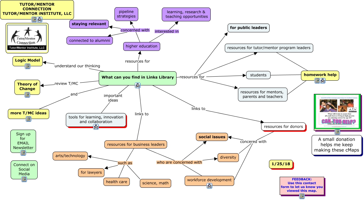This Concept Map, created with IHMC CmapTools, has information related to: guide for links library users, What can you find in Links Library resources for resources for tutor/mentor program leaders, What can you find in Links Library links to resources for donors, resources for business leaders who are concerned with workforce development, What can you find in Links Library and more T/MC ideas, resources for donors concered with diversity, resources for business leaders such as health care, resources for business leaders such as arts/technology, homework help ???? resources for tutor/mentor program leaders, What can you find in Links Library review T/MC Theory of Change, What can you find in Links Library understand our thinking Logic Model, What can you find in Links Library resources for for public leaders, resources for donors concered with workforce development, resources for donors concered with social issues, homework help ???? students, resources for business leaders such as for lawyers, higher education concerned with connected to alumnni, What can you find in Links Library resources for students, homework help ???? resources for mentors, parents and teachers, resources for business leaders who are concerned with diversity, resources for business leaders such as science, math