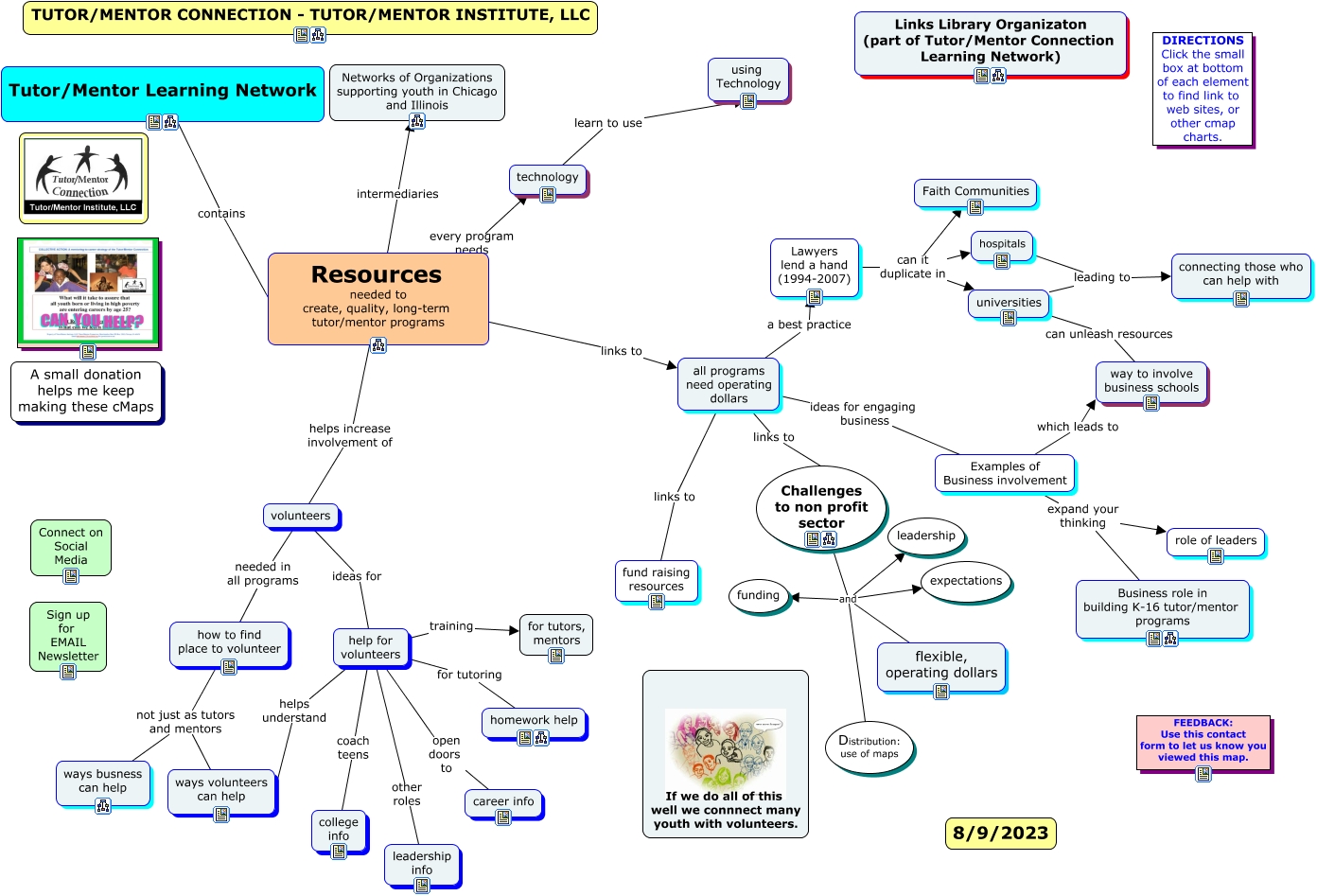 This Concept Map, created with IHMC CmapTools, has information related to: Learning Library - Resource Links, Lawyers lend a hand (1994-2007) can it duplicate in universities, Tutor/Mentor Learning Network contains Resources needed to create, quality, long-term tutor/mentor programs, technology learn to use using Technology, Examples of Business involvement expand your thinking Business role in building K-16 tutor/mentor programs, how to find place to volunteer not just as tutors and mentors ways busness can help, Resources needed to create, quality, long-term tutor/mentor programs helps increase involvement of volunteers, all programs need operating dollars links to fund raising resources, help for volunteers training for tutors, mentors, Resources needed to create, quality, long-term tutor/mentor programs links to all programs need operating dollars, all programs need operating dollars ideas for engaging business Examples of Business involvement, Lawyers lend a hand (1994-2007) can it duplicate in hospitals, help for volunteers open doors to career info, Examples of Business involvement expand your thinking role of leaders, how to find place to volunteer not just as tutors and mentors ways volunteers can help, Resources needed to create, quality, long-term tutor/mentor programs every program needs technology, help for volunteers coach teens college info, volunteers needed in all programs how to find place to volunteer, help for volunteers other roles leadership info, all programs need operating dollars a best practice Lawyers lend a hand (1994-2007), Challenges to non profit sector and funding