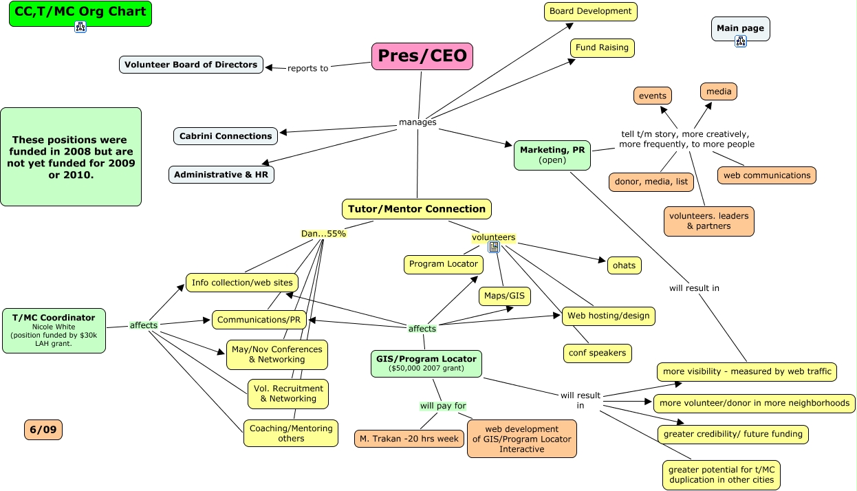 This Concept Map has information related to: CC, TMC Org Chart - 2008 funding, GIS/Program Locator ($50,000 2007 grant) will result in more visibility - measured by web traffic, Marketing, PR (open) tell t/m story, more creatively, more frequently, to more people volunteers. leaders & partners, T/MC Coordinator Nicole White (position funded by $30k LAH grant. affects Info collection/web sites, Marketing, PR (open) tell t/m story, more creatively, more frequently, to more people media, Tutor/Mentor Connection Dan...55% Coaching/Mentoring others, Pres/CEO manages Cabrini Connections, Tutor/Mentor Connection volunteers Maps/GIS, GIS/Program Locator ($50,000 2007 grant) will result in more volunteer/donor in more neighborhoods, Marketing, PR (open) tell t/m story, more creatively, more frequently, to more people web communications, Pres/CEO manages Board Development