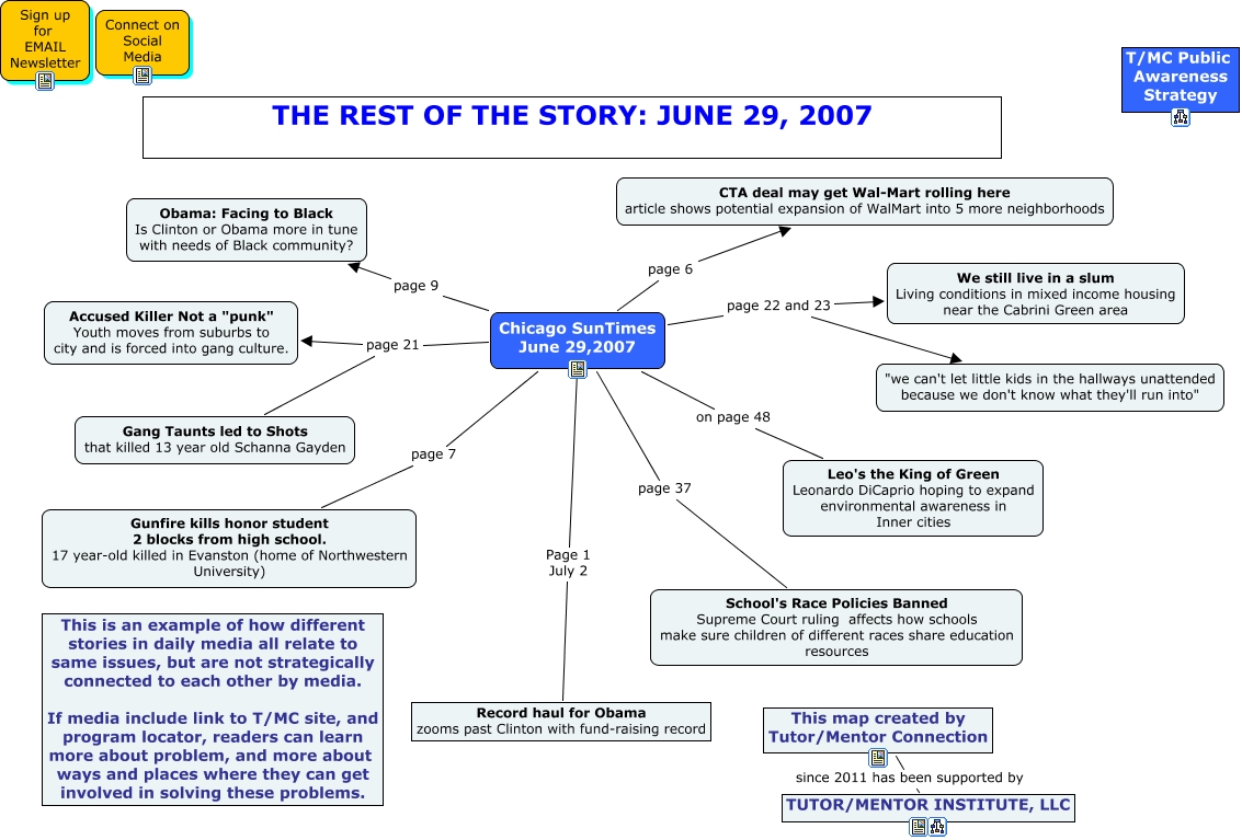 This Concept Map, created with IHMC CmapTools, has information related to: SunTimes 6_29_07, Chicago SunTimes June 29,2007 on page 48 Leo's the King of Green Leonardo DiCaprio hoping to expand environmental awareness in Inner cities, Chicago SunTimes June 29,2007 page 6 CTA deal may get Wal-Mart rolling here article shows potential expansion of WalMart into 5 more neighborhoods, Chicago SunTimes June 29,2007 page 21 Accused Killer Not a "punk" Youth moves from suburbs to city and is forced into gang culture., Chicago SunTimes June 29,2007 page 22 and 23 "we can't let little kids in the hallways unattended because we don't know what they'll run into", Chicago SunTimes June 29,2007 page 22 and 23 We still live in a slum Living conditions in mixed income housing near the Cabrini Green area, Chicago SunTimes June 29,2007 page 21 Gang Taunts led to Shots that killed 13 year old Schanna Gayden, Chicago SunTimes June 29,2007 Page 1 July 2 Record haul for Obama zooms past Clinton with fund-raising record, Chicago SunTimes June 29,2007 page 9 Obama: Facing to Black Is Clinton or Obama more in tune with needs of Black community?, Chicago SunTimes June 29,2007 page 37 School's Race Policies Banned Supreme Court ruling affects how schools make sure children of different races share education resources, This map created by Tutor/Mentor Connection since 2011 has been supported by TUTOR/MENTOR INSTITUTE, LLC, Chicago SunTimes June 29,2007 page 7 Gunfire kills honor student 2 blocks from high school. 17 year-old killed in Evanston (home of Northwestern University)