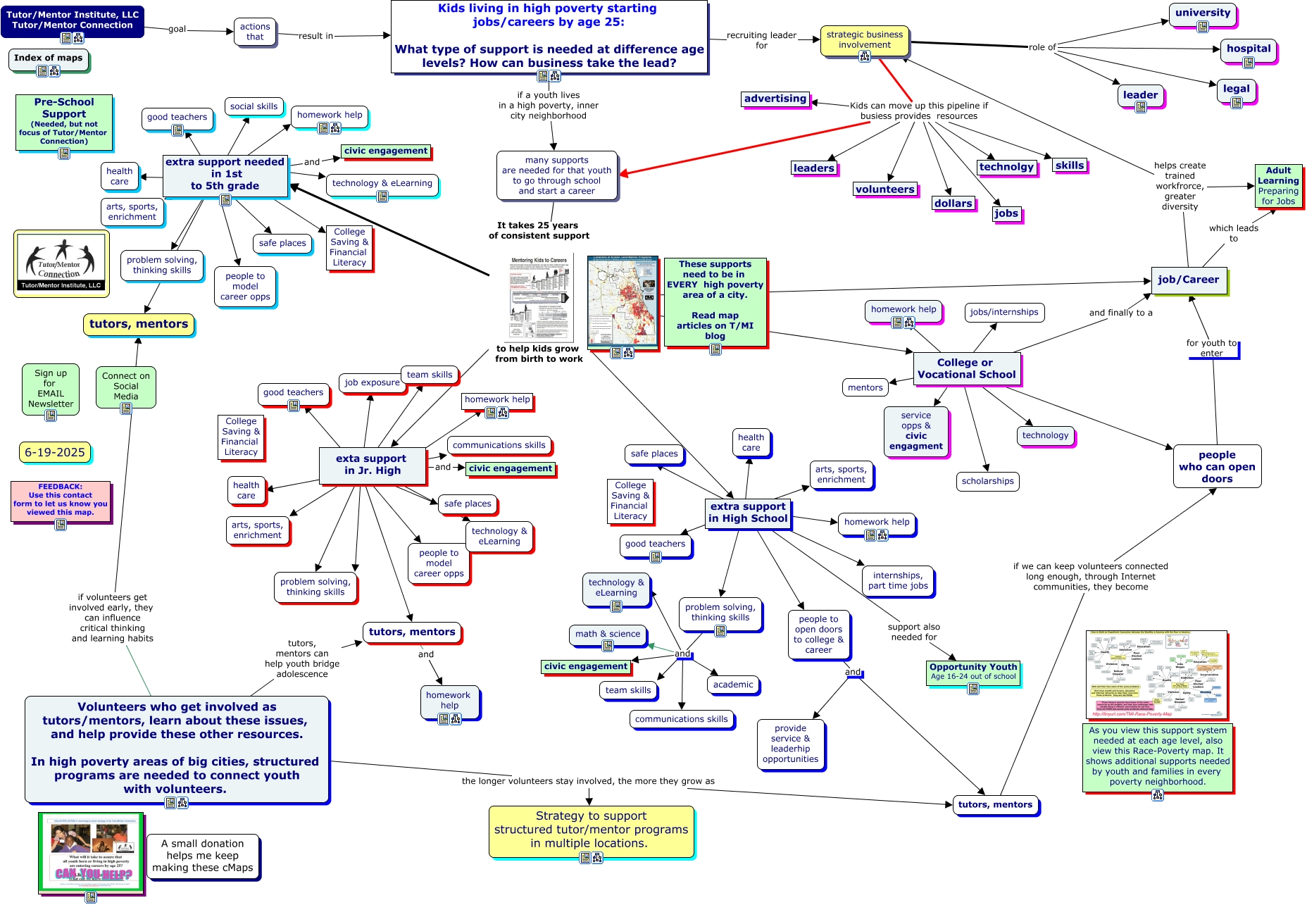 This Concept Map, created with IHMC CmapTools, has information related to: Mentoring Kids to Careers a, exta support in Jr. High supports needed safe places, people to open doors to college & career and tutors, mentors, Volunteers who get involved as tutors/mentors, learn about these issues, and help provide these other resources. In high poverty areas of big cities, structured programs are needed to connect youth with volunteers. the longer volunteers stay involved, the more they grow as Strategy to support structured tutor/mentor programs in multiple locations., College or Vocational School supports still needed scholarships, extra support needed in 1st to 5th grade supports needed arts, sports, enrichment, many supports are needed for that youth to go through school and start a career It takes 25 years of consistent support to help kids grow from birth to work extra support needed in 1st to 5th grade, actions that result in Kids living in high poverty starting jobs/careers by age 25: What type of support is needed at difference age levels? How can business take the lead?, many supports are needed for that youth to go through school and start a career It takes 25 years of consistent support to help kids grow from birth to work College or Vocational School, College or Vocational School supports still needed jobs/internships, strategic business involvement role of legal, exta support in Jr. High supports needed communications skills, Tutor/Mentor Institute, LLC Tutor/Mentor Connection goal actions that, extra support needed in 1st to 5th grade supports needed homework help, strategic business involvement role of university, exta support in Jr. High supports needed team skills, extra support needed in 1st to 5th grade supports needed tutors, mentors, strategic business involvement Kids can move up this pipeline if busiess provides resources skills, exta support in Jr. High and civic engagement, extra support needed in 1st to 5th grade supports needed people to model career opps, job/Career which leads to Adult Learning Preparing for Jobs