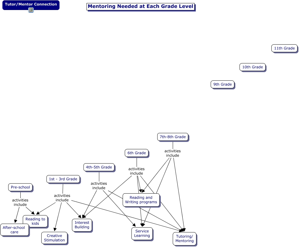This Concept Map has information related to: Age Specific Mentoring, 4th-5th Grade activities include Interest Building, 1st - 3rd Grade activities include Reading to kids, 7th-8th Grade activities include Tutoring/ Mentoring, 1st - 3rd Grade activities include Tutoring/ Mentoring, 4th-5th Grade activities include Service Learning, Pre-school activities include After-school care, 1st - 3rd Grade activities include Creative Stimulation, 6th Grade activities include Interest Building, 6th Grade activities include Tutoring/ Mentoring, 1st - 3rd Grade activities include Interest Building