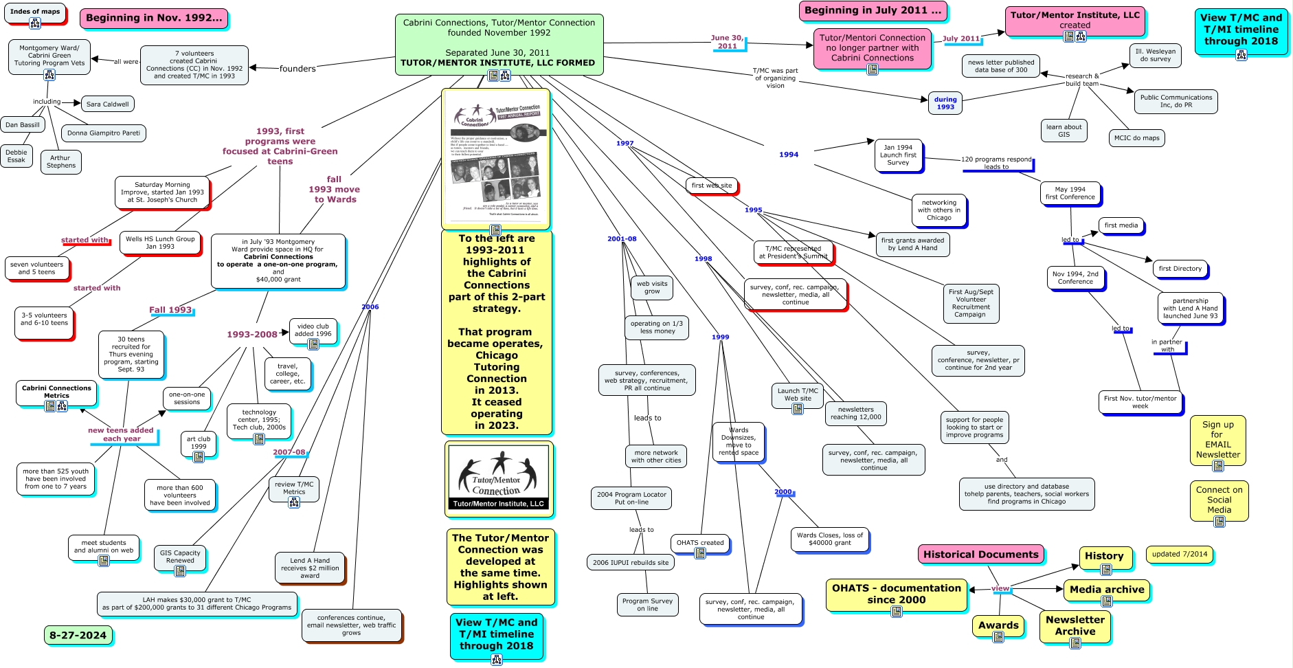 This Concept Map, created with IHMC CmapTools, has information related to: Cabrini Connections and TMC timeline, in July '93 Montgomery Ward provide space in HQ for Cabrini Connections to operate a one-on-one program, and $40,000 grant 1993-2008 technology center, 1995; Tech club, 2000s, Nov 1994, 2nd Conference led to First Nov. tutor/mentor week, Jan 1994 Launch first Survey 120 programs respond leads to May 1994 first Conference, Cabrini Connections, Tutor/Mentor Connection founded November 1992 Separated June 30, 2011 TUTOR/MENTOR INSTITUTE, LLC FORMED 2006 Lend A Hand receives $2 million award, 2004 Program Locator Put on-line leads to Program Survey on line, Cabrini Connections, Tutor/Mentor Connection founded November 1992 Separated June 30, 2011 TUTOR/MENTOR INSTITUTE, LLC FORMED 1995 survey, conference, newsletter, pr continue for 2nd year, 30 teens recruited for Thurs evening program, starting Sept. 93 new teens added each year more than 600 volunteers have been involved, Cabrini Connections, Tutor/Mentor Connection founded November 1992 Separated June 30, 2011 TUTOR/MENTOR INSTITUTE, LLC FORMED 2007-08 LAH makes $30,000 grant to T/MC as part of $200,000 grants to 31 different Chicago Programs, in July '93 Montgomery Ward provide space in HQ for Cabrini Connections to operate a one-on-one program, and $40,000 grant Fall 1993 30 teens recruited for Thurs evening program, starting Sept. 93, 30 teens recruited for Thurs evening program, starting Sept. 93 new teens added each year meet students and alumni on web, Cabrini Connections, Tutor/Mentor Connection founded November 1992 Separated June 30, 2011 TUTOR/MENTOR INSTITUTE, LLC FORMED 1995 support for people looking to start or improve programs, Cabrini Connections, Tutor/Mentor Connection founded November 1992 Separated June 30, 2011 TUTOR/MENTOR INSTITUTE, LLC FORMED 1999 OHATS created, Cabrini Connections, Tutor/Mentor Connection founded November 1992 Separated June 30, 2011 TUTOR/MENTOR INSTITUTE, LLC FORMED fall 1993 move to Wards in July '93 Montgomery Ward provide space in HQ for Cabrini Connections to operate a one-on-one program, and $40,000 grant, Cabrini Connections, Tutor/Mentor Connection founded November 1992 Separated June 30, 2011 TUTOR/MENTOR INSTITUTE, LLC FORMED 1998 Launch T/MC Web site, Cabrini Connections, Tutor/Mentor Connection founded November 1992 Separated June 30, 2011 TUTOR/MENTOR INSTITUTE, LLC FORMED 2001-08 survey, conferences, web strategy, recruitment, PR all continue, Wards Downsizes, move to rented space 2000 survey, conf, rec. campaign, newsletter, media, all continue, Cabrini Connections, Tutor/Mentor Connection founded November 1992 Separated June 30, 2011 TUTOR/MENTOR INSTITUTE, LLC FORMED 1993, first programs were focused at Cabrini-Green teens Wells HS Lunch Group Jan 1993, during 1993 research & build team MCIC do maps, Cabrini Connections, Tutor/Mentor Connection founded November 1992 Separated June 30, 2011 TUTOR/MENTOR INSTITUTE, LLC FORMED 1997 first web site, in July '93 Montgomery Ward provide space in HQ for Cabrini Connections to operate a one-on-one program, and $40,000 grant 1993-2008 video club added 1996