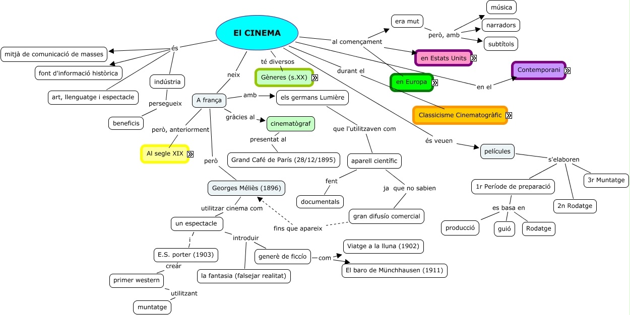 Este Cmap, tiene información relacionada con: tema 15. El cinema - Sofia Benito, era mut però, amb subtítols, cinematògraf presentat al Grand Café de París (28/12/1895), SGM s'introdueix missatge patriòtic, quaranta i cinquanta a Itàlia, I.Bergman centrar en 1r. Comedies, Primera Guerra Mundial aprofitar i desenvolupar el nou mitjà Alemanya, 1r Període de preparació es basa en Rodatge, una vinculació social en la SGM, una vinculació social amb traves religioses i polítiques, fotografia a més E.J. Marey, Regne Unit imposar films d'orientació social i documentalistes, Thriller de gàngsters exalta joc, Primera Guerra Mundial aprofitar i desenvolupar el nou mitjà Espanya, Unió soviètica quedar supeditat a un model oficial, Europa caure en crisis, Musical té decorats cridaners, primer western utilitzant muntatge, Alemanya obres més destacades Nosferatu (1922) F.W.Muranu, generè de ficcío com Viatge a la lluna (1902), anys trenta imposà dirigisme cinematogràfic