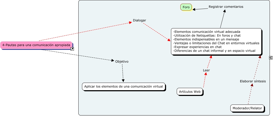 Este Cmap, tiene información relacionada con: PD - Tema 4, -Elementos comunicación virtual adecuada -Utilización de Netiquettas: En foros y chat -Elementos indispensables en un mensaje -Ventajas o limitaciones del Chat en entornos virtuales -Expresar experiencias en chat -Diferencias de un chat informal y en espacio virtual Registrar comentarios Foro, 4-Pautas para una comunicación apropiada Objetivo Aplicar los elementos de una comunicación virtual, Artículos Web Leer -Elementos comunicación virtual adecuada -Utilización de Netiquettas: En foros y chat -Elementos indispensables en un mensaje -Ventajas o limitaciones del Chat en entornos virtuales -Expresar experiencias en chat -Diferencias de un chat informal y en espacio virtual, Moderador/Relator Elaborar síntesis -Elementos comunicación virtual adecuada -Utilización de Netiquettas: En foros y chat -Elementos indispensables en un mensaje -Ventajas o limitaciones del Chat en entornos virtuales -Expresar experiencias en chat -Diferencias de un chat informal y en espacio virtual, 4-Pautas para una comunicación apropiada Dialogar -Elementos comunicación virtual adecuada -Utilización de Netiquettas: En foros y chat -Elementos indispensables en un mensaje -Ventajas o limitaciones del Chat en entornos virtuales -Expresar experiencias en chat -Diferencias de un chat informal y en espacio virtual