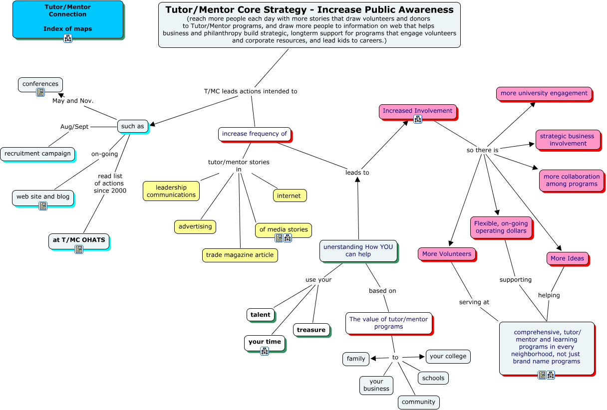 This Concept Map has information related to: Public Awareness Strategy, increase frequency of tutor/mentor stories in trade magazine article, such as read list of actions since 2000 at T/MC OHATS, The value of tutor/mentor programs to community, Tutor/Mentor Core Strategy - Increase Public Awareness (reach more people each day with more stories that draw volunteers and donors to Tutor/Mentor programs, and draw more people to information on web that helps business and philanthropy build strategic, longterm support for programs that engage volunteers and corporate resources, and lead kids to careers.) T/MC leads actions intended to increase frequency of, Increased Involvement so there is Flexible, on-going operating dollars, unerstanding How YOU can help use your your time, such as Aug/Sept recruitment campaign, increase frequency of leads to Increased Involvement, unerstanding How YOU can help based on The value of tutor/mentor programs, Increased Involvement so there is strategic business involvement