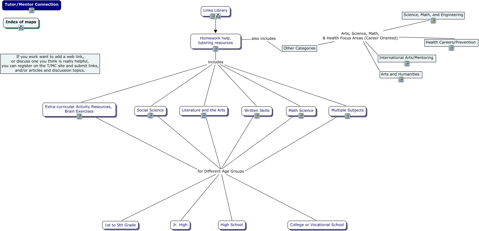 This Concept Map has information related to: Learning Network Library-Homework help, Homework help, tutoring resources includes Social Science, Math Science for Different Age Groups College or Vocational School, Homework help, tutoring resources includes Literature and the Arts, Social Science for Different Age Groups 1st to 5th Grade, Extra-curricular Activity Resources, Brain Exercises for Different Age Groups High School, Literature and the Arts for Different Age Groups 1st to 5th Grade, Multiple Subjects for Different Age Groups High School, Homework help, tutoring resources includes Multiple Subjects, Multiple Subjects for Different Age Groups College or Vocational School, Extra-curricular Activity Resources, Brain Exercises for Different Age Groups College or Vocational School