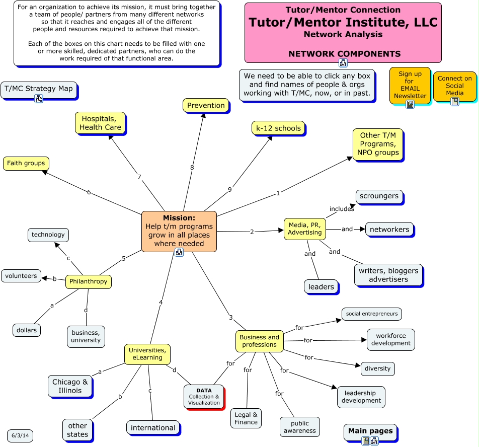 This Concept Map, created with IHMC CmapTools, has information related to: Tutor Mentor Connection Network Analysis - Network, Mission: Help t/m programs grow in all places where needed 4 Universities, eLearning, Business and professions for public awareness, Business and professions for leadership development, Mission: Help t/m programs grow in all places where needed 2 Media, PR, Advertising, Mission: Help t/m programs grow in all places where needed 9 k-12 schools, Universities, eLearning a Chicago & Illinois, Business and professions for DATA Collection & Visualization, Universities, eLearning b other states, Philanthropy a dollars, Media, PR, Advertising includes scroungers, Mission: Help t/m programs grow in all places where needed 7 Hospitals, Health Care, Media, PR, Advertising and leaders, Philanthropy b volunteers, Business and professions for diversity, Philanthropy c technology, Media, PR, Advertising and networkers, Universities, eLearning c international, Business and professions for Legal & Finance, Media, PR, Advertising and writers, bloggers advertisers, Philanthropy d business, university