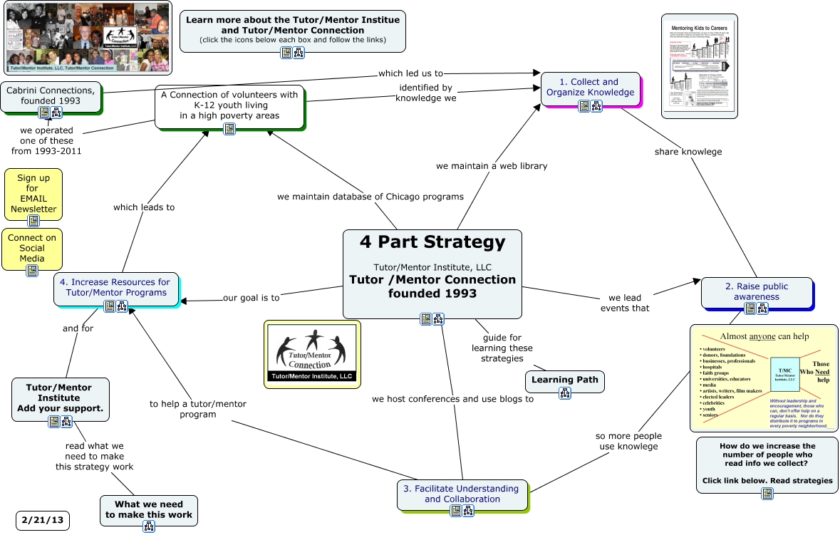 This Concept Map, created with IHMC CmapTools, has information related to: four part strategy, 3. Facilitate Understanding and Collaboration to help a tutor/mentor program 4. Increase Resources for Tutor/Mentor Programs, 2. Raise public awareness so more people use knowlege 3. Facilitate Understanding and Collaboration, 4. Increase Resources for Tutor/Mentor Programs and for Tutor/Mentor Institute Add your support., A Connection of volunteers with K-12 youth living in a high poverty areas identified by knowledge we 1. Collect and Organize Knowledge, 4 Part Strategy Tutor/Mentor Institute, LLC Tutor /Mentor Connection founded 1993 we maintain a web library 1. Collect and Organize Knowledge, 4 Part Strategy Tutor/Mentor Institute, LLC Tutor /Mentor Connection founded 1993 we maintain database of Chicago programs A Connection of volunteers with K-12 youth living in a high poverty areas, Cabrini Connections, founded 1993 which led us to 1. Collect and Organize Knowledge, 4 Part Strategy Tutor/Mentor Institute, LLC Tutor /Mentor Connection founded 1993 we host conferences and use blogs to 3. Facilitate Understanding and Collaboration, 4 Part Strategy Tutor/Mentor Institute, LLC Tutor /Mentor Connection founded 1993 our goal is to 4. Increase Resources for Tutor/Mentor Programs, Tutor/Mentor Institute Add your support. read what we need to make this strategy work What we need to make this work, A Connection of volunteers with K-12 youth living in a high poverty areas we operated one of these from 1993-2011 Cabrini Connections, founded 1993, 1. Collect and Organize Knowledge share knowlege 2. Raise public awareness, 4. Increase Resources for Tutor/Mentor Programs which leads to A Connection of volunteers with K-12 youth living in a high poverty areas, 4 Part Strategy Tutor/Mentor Institute, LLC Tutor /Mentor Connection founded 1993 guide for learning these strategies Learning Path, 4 Part Strategy Tutor/Mentor Institute, LLC Tutor /Mentor Connection founded 1993 we lead events that 2. Raise public awareness