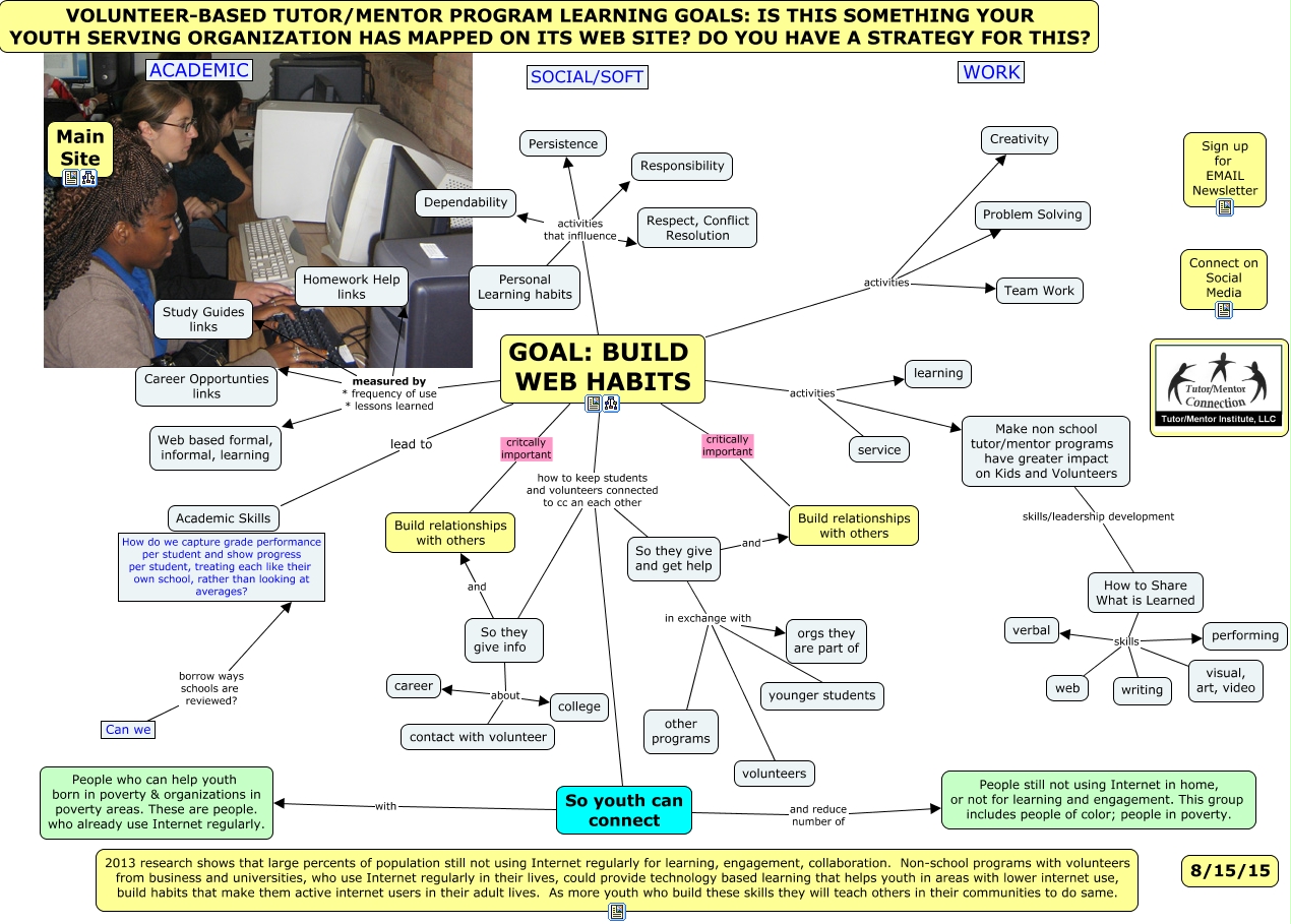 This Concept Map, created with IHMC CmapTools, has information related to: CC Learning Goals, GOAL: BUILD WEB HABITS activities learning, How to Share What is Learned skills web, GOAL: BUILD WEB HABITS measured by * frequency of use * lessons learned Homework Help links, GOAL: BUILD WEB HABITS lead to Academic Skills, So they give info about contact with volunteer, So they give info about college, Can we borrow ways schools are reviewed? How do we capture grade performance per student and show progress per student, treating each like their own school, rather than looking at averages?, How to Share What is Learned skills writing, So they give and get help in exchange with younger students, GOAL: BUILD WEB HABITS activities that inflluence Personal Learning habits, So they give and get help in exchange with other programs, GOAL: BUILD WEB HABITS measured by * frequency of use * lessons learned Career Opportunties links, GOAL: BUILD WEB HABITS activities Make non school tutor/mentor programs have greater impact on Kids and Volunteers, GOAL: BUILD WEB HABITS activities that inflluence Responsibility, So youth can connect with People who can help youth born in poverty & organizations in poverty areas. These are people. who already use Internet regularly., Make non school tutor/mentor programs have greater impact on Kids and Volunteers skills/leadership development How to Share What is Learned, How to Share What is Learned skills visual, art, video, GOAL: BUILD WEB HABITS activities Team Work, GOAL: BUILD WEB HABITS activities that inflluence Persistence, GOAL: BUILD WEB HABITS measured by * frequency of use * lessons learned Web based formal, informal, learning