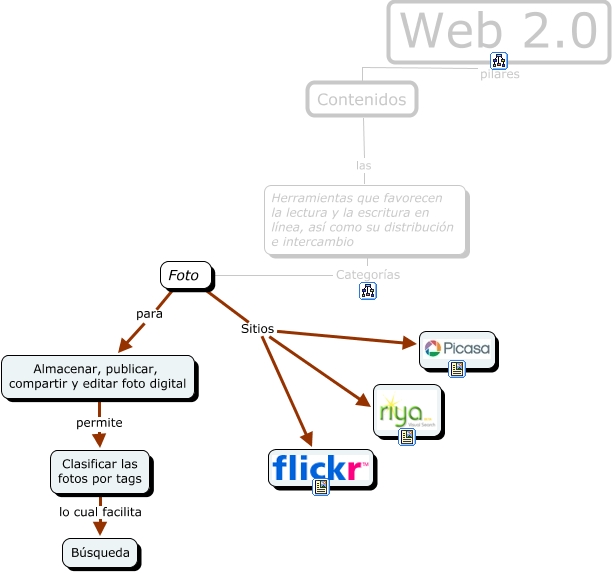 Este Cmap, tiene información relacionada con: Paginas Fotos, Web 2.0 pilares Contenidos, Herramientas que favorecen la lectura y la escritura en línea, así como su distribución e intercambio Categorías Foto, Clasificar las fotos por tags lo cual facilita Búsqueda, Contenidos las Herramientas que favorecen la lectura y la escritura en línea, así como su distribución e intercambio, Almacenar, publicar, compartir y editar foto digital permite Clasificar las fotos por tags, Foto para Almacenar, publicar, compartir y editar foto digital, Foto Sitios, Foto Sitios, Foto Sitios
