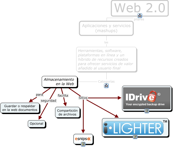 Este Cmap, tiene información relacionada con: Paginas almacenamiento en la web, Almacenamiento en la Web para Guardar o respaldar en la web documentos, Almacenamiento en la Web facilita Compartición de archivos, Almacenamiento en la Web Sitios, Almacenamiento en la Web Sitios, Web 2.0 pilares Aplicaciones y servicios (mashups), Almacenamiento en la Web Sitios, Herramientas, software, plataformas en línea y un híbrido de recursos creados para ofrecer servicios de valor añadido al usuario final Categorías Almacenamiento en la Web, Almacenamiento en la Web seguridad Opcional, Aplicaciones y servicios (mashups) las Herramientas, software, plataformas en línea y un híbrido de recursos creados para ofrecer servicios de valor añadido al usuario final