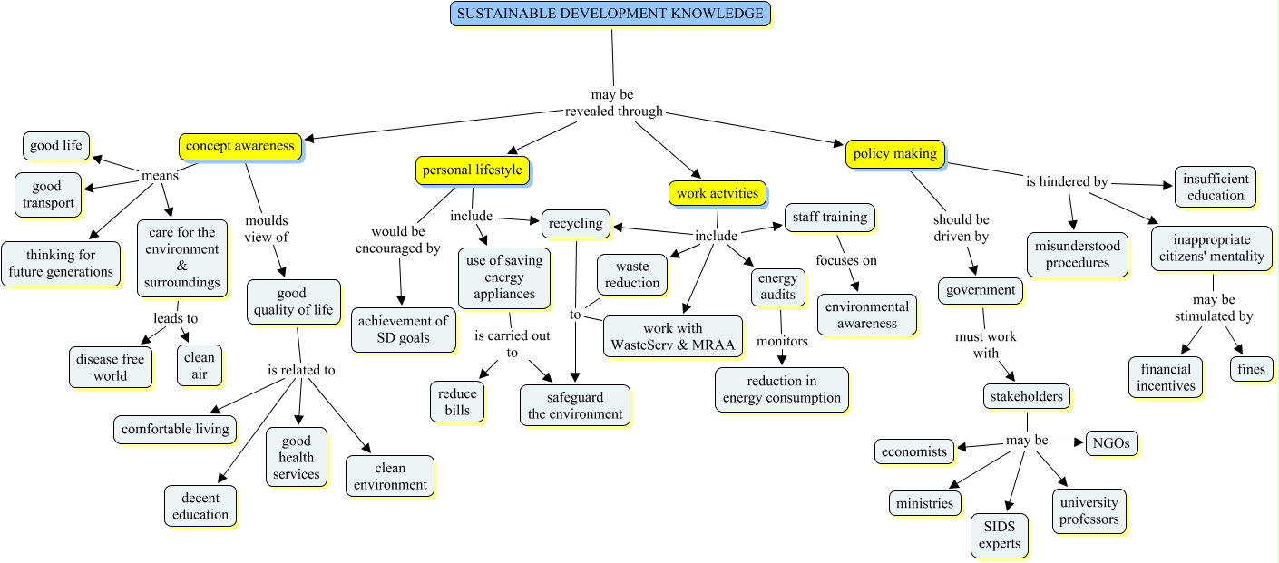 This Concept Map, created with IHMC CmapTools, has information related to: GL2, stakeholders may be university professors, inappropriate citizens' mentality may be stimulated by fines, good quality of life is related to clean environment, stakeholders may be SIDS experts, waste reduction to safeguard the environment, SUSTAINABLE DEVELOPMENT KNOWLEDGE may be revealed through work actvities, good quality of life is related to good health services, work actvities include work with WasteServ & MRAA, policy making is hindered by inappropriate citizens' mentality, energy audits monitors reduction in energy consumption, use of saving energy appliances is carried out to reduce bills, use of saving energy appliances is carried out to safeguard the environment, concept awareness means care for the environment & surroundings, stakeholders may be economists, personal lifestyle include recycling, stakeholders may be NGOs, policy making should be driven by government, good quality of life is related to decent education, work actvities include energy audits, work actvities include waste reduction