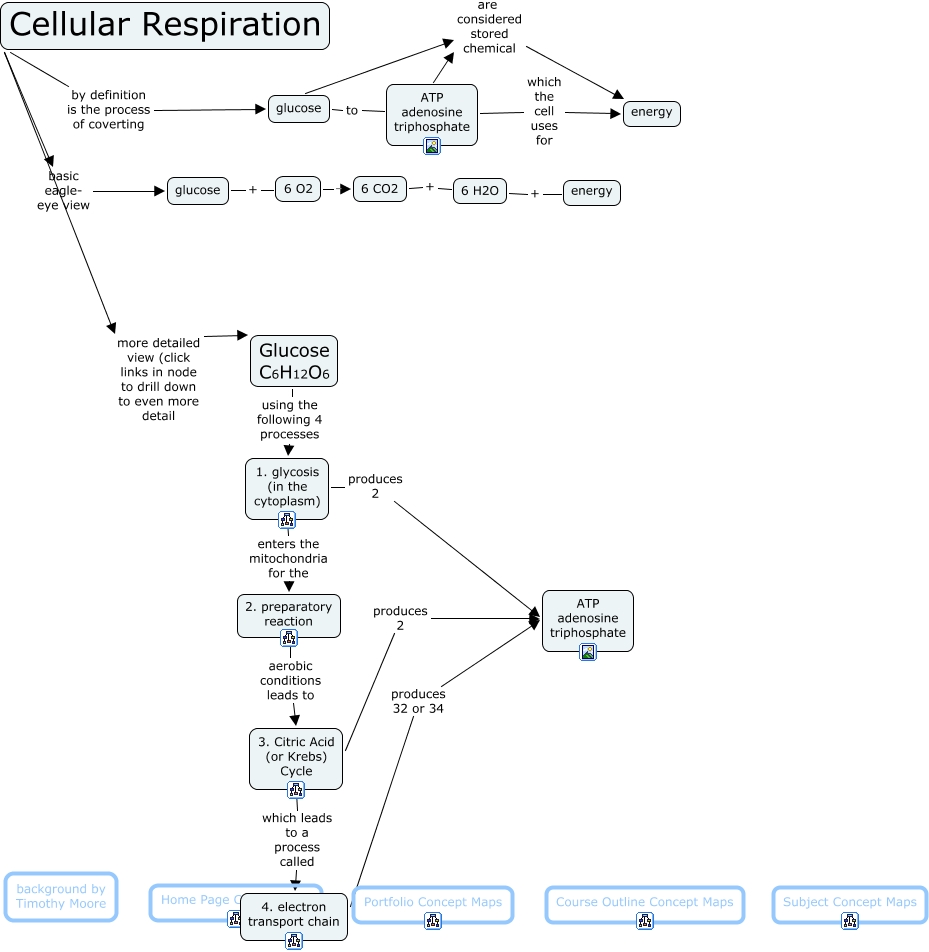 This Concept Map, created with IHMC CmapTools, has information related to: Cellular Respiration, ATP adenosine triphosphate are considered stored chemical energy, Glucose C6H12O6 using the following 4 processes 1. glycosis (in the cytoplasm), 1. glycosis (in the cytoplasm) enters the mitochondria for the 2. preparatory reaction, Cellular Respiration by definition is the process of coverting glucose, 3. Citric Acid (or Krebs) Cycle produces 2 ATP adenosine triphosphate, glucose + 6 O2, 6 H2O + energy, 4. electron transport chain produces 32 or 34 ATP adenosine triphosphate, glucose are considered stored chemical energy, ATP adenosine triphosphate which the cell uses for energy, 2. preparatory reaction aerobic conditions leads to 3. Citric Acid (or Krebs) Cycle, glucose to ATP adenosine triphosphate, 6 CO2 + 6 H2O, 1. glycosis (in the cytoplasm) produces 2 ATP adenosine triphosphate, 6 O2 - 6 CO2, Cellular Respiration basic eagle- eye view glucose, Cellular Respiration more detailed view (click links in node to drill down to even more detail Glucose C6H12O6, 3. Citric Acid (or Krebs) Cycle which leads to a process called 4. electron transport chain