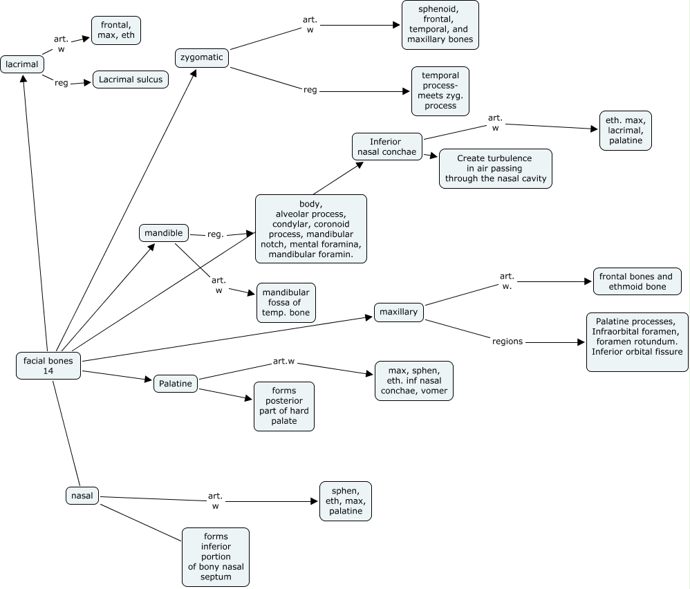 This Concept Map, created with IHMC CmapTools, has information related to: facial bones, Inferior nasal conchae Create turbulence in air passing through the nasal cavity, nasal art. w sphen, eth, max, palatine, lacrimal reg Lacrimal sulcus, nasal forms inferior portion of bony nasal septum, facial bones 14 zygomatic, facial bones 14 Palatine, zygomatic reg temporal process- meets zyg. process, zygomatic art. w sphenoid, frontal, temporal, and maxillary bones, maxillary art. w. frontal bones and ethmoid bone, facial bones 14 mandible, facial bones 14 lacrimal, mandible art. w mandibular fossa of temp. bone, facial bones 14 Inferior nasal conchae, lacrimal art. w frontal, max, eth, maxillary regions Palatine processes, Infraorbital foramen, foramen rotundum. Inferior orbital fissure, Inferior nasal conchae art. w eth. max, lacrimal, palatine, facial bones 14 nasal, Palatine art.w max, sphen, eth. inf nasal conchae, vomer, mandible reg. body, alveolar process, condylar, coronoid process, mandibular notch, mental foramina, mandibular foramin., Palatine forms posterior part of hard palate