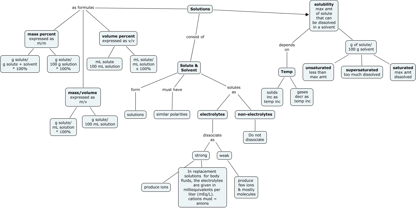 This Concept Map, created with IHMC CmapTools, has information related to: Solutions, g of solute/ 100 g solvent saturated max amt dissolved, solubility max amt of solute that can be dissolved in a solvent depends on Temp, Solute & Solvent solutes as electrolytes, Temp gases decr as temp inc, Solutions consist of Solute & Solvent, Solute & Solvent form solutions, Solutions as formulas mass/volume expressed as m/v, g of solute/ 100 g solvent supersaturated too much dissolved, mass/volume expressed as m/v g solute/ mL solution * 100%, non-electrolytes Do not dissociate, Solutions as formulas volume percent expressed as v/v, volume percent expressed as v/v mL solute/ mL solution x 100%, solubility max amt of solute that can be dissolved in a solvent g of solute/ 100 g solvent, strong produce ions, electrolytes dissociate as weak, volume percent expressed as v/v mL solute 100 mL solution, Solutions solubility max amt of solute that can be dissolved in a solvent, Solute & Solvent solutes as non-electrolytes, g of solute/ 100 g solvent unsaturated less than max amt, mass/volume expressed as m/v g solute/ 100 mL solution