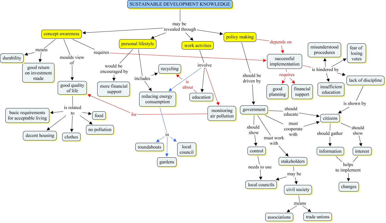 This Concept Map, created with IHMC CmapTools, has information related to: Robert, information helps to implement changes, policy making should be driven by government, concept awareness requires successful implementation, personal lifestyle includes reducing energy consumption, work actvities involve education, SUSTAINABLE DEVELOPMENT KNOWLEDGE may be revealed through work actvities, successful implementation requires good planning, stakeholders may be civil society, SUSTAINABLE DEVELOPMENT KNOWLEDGE may be revealed through personal lifestyle, SUSTAINABLE DEVELOPMENT KNOWLEDGE may be revealed through concept awareness, citizens should show interest, interest helps to implement changes, successful implementation is hindered by fear of losing votes, work actvities involve monitoring air pollution, lack of discipline is shown by citizens, government should show control, civil society means trade unions, monitoring air pollution for good quality of life, SUSTAINABLE DEVELOPMENT KNOWLEDGE may be revealed through policy making, concept awareness means durability