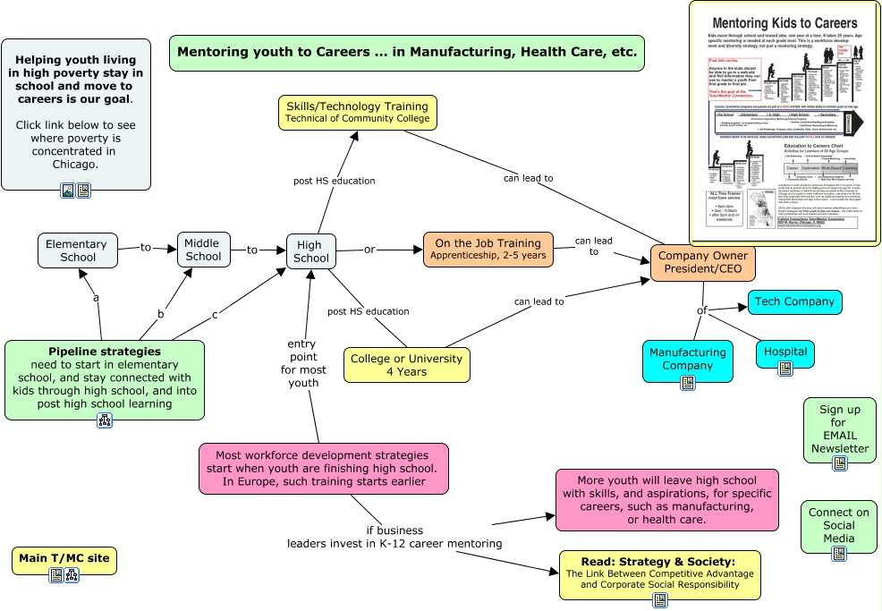 This Concept Map, created with IHMC CmapTools, has information related to: Career pipeline, On the Job Training Apprenticeship, 2-5 years can lead to Company Owner President/CEO, Elementary School to Middle School, Company Owner President/CEO of Tech Company, Pipeline strategies need to start in elementary school, and stay connected with kids through high school, and into post high school learning c High School, Middle School to High School, Most workforce development strategies start when youth are finishing high school. In Europe, such training starts earlier if business leaders invest in K-12 career mentoring Read: Strategy & Society: The Link Between Competitive Advantage and Corporate Social Responsibility, High School post HS education Skills/Technology Training Technical of Community College, Pipeline strategies need to start in elementary school, and stay connected with kids through high school, and into post high school learning a Elementary School, High School post HS education College or University 4 Years, Most workforce development strategies start when youth are finishing high school. In Europe, such training starts earlier if business leaders invest in K-12 career mentoring More youth will leave high school with skills, and aspirations, for specific careers, such as manufacturing, or health care., Company Owner President/CEO of Manufacturing Company, College or University 4 Years can lead to Company Owner President/CEO, Skills/Technology Training Technical of Community College can lead to Company Owner President/CEO, High School or On the Job Training Apprenticeship, 2-5 years, Company Owner President/CEO of Hospital, Most workforce development strategies start when youth are finishing high school. In Europe, such training starts earlier entry point for most youth High School, Pipeline strategies need to start in elementary school, and stay connected with kids through high school, and into post high school learning b Middle School