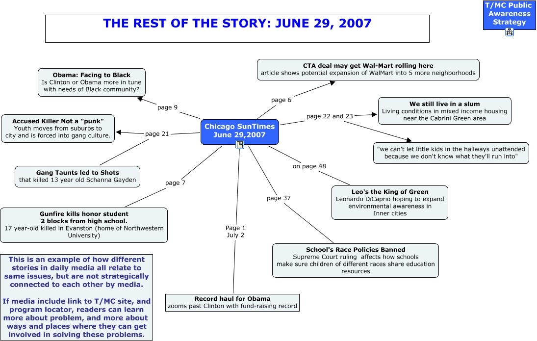 This Concept Map has information related to: SunTimes 6_29_07, Chicago SunTimes June 29,2007 page 22 and 23 "we can't let little kids in the hallways unattended because we don't know what they'll run into", Chicago SunTimes June 29,2007 page 21 Accused Killer Not a "punk" Youth moves from suburbs to city and is forced into gang culture., Chicago SunTimes June 29,2007 page 6 CTA deal may get Wal-Mart rolling here article shows potential expansion of WalMart into 5 more neighborhoods, Chicago SunTimes June 29,2007 on page 48 Leo's the King of Green Leonardo DiCaprio hoping to expand environmental awareness in Inner cities, Chicago SunTimes June 29,2007 page 21 Gang Taunts led to Shots that killed 13 year old Schanna Gayden, Chicago SunTimes June 29,2007 page 22 and 23 We still live in a slum Living conditions in mixed income housing near the Cabrini Green area, Chicago SunTimes June 29,2007 Page 1 July 2 Record haul for Obama zooms past Clinton with fund-raising record, Chicago SunTimes June 29,2007 page 9 Obama: Facing to Black Is Clinton or Obama more in tune with needs of Black community?, Chicago SunTimes June 29,2007 page 37 School's Race Policies Banned Supreme Court ruling affects how schools make sure children of different races share education resources, Chicago SunTimes June 29,2007 page 7 Gunfire kills honor student 2 blocks from high school. 17 year-old killed in Evanston (home of Northwestern University)