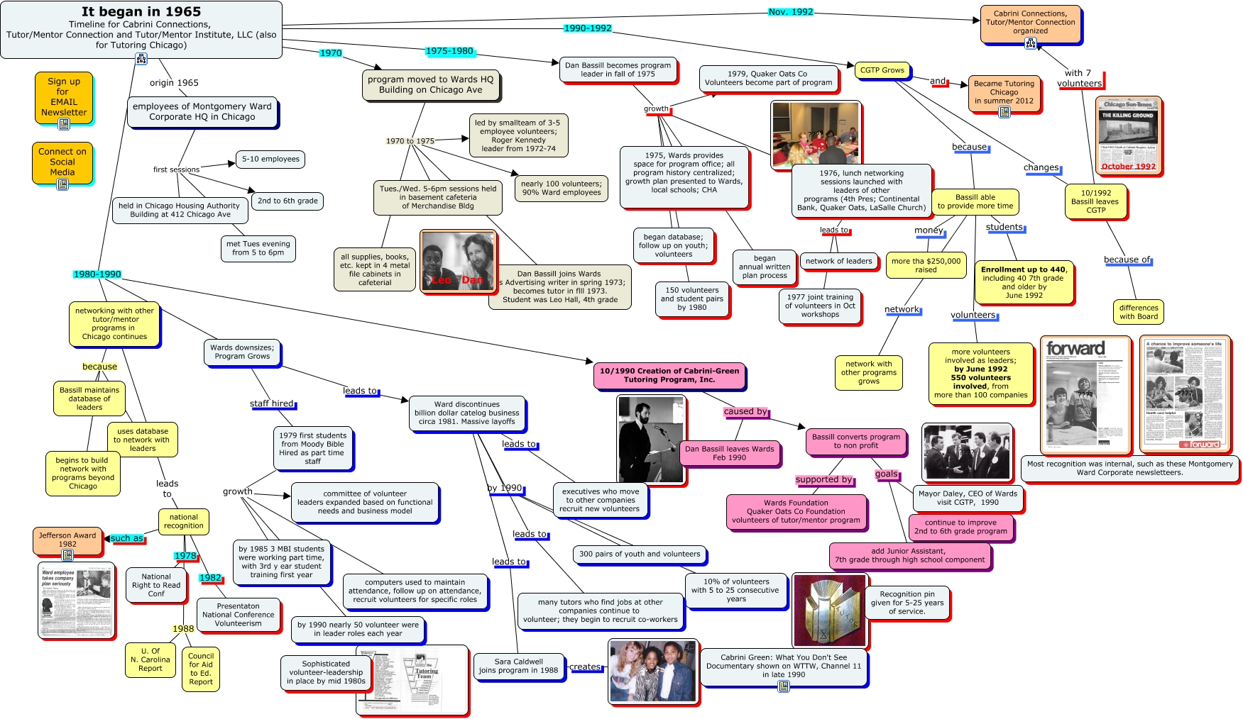 This Concept Map, created with IHMC CmapTools, has information related to: timeline 1965 to 1992, Dan Bassill becomes program leader in fall of 1975 growth 150 volunteers and student pairs by 1980, national recognition 1982 Presentaton National Conference Volunteerism, Ward discontinues billion dollar catelog business circa 1981. Massive layoffs by 1990 10% of volunteers with 5 to 25 consecutive years, networking with other tutor/mentor programs in Chicago continues because uses database to network with leaders, 10/1990 Creation of Cabrini-Green Tutoring Program, Inc. caused by Bassill converts program to non profit, Bassill able to provide more time money more tha $250,000 raised, It began in 1965 Timeline for Cabrini Connections, Tutor/Mentor Connection and Tutor/Mentor Institute, LLC (also for Tutoring Chicago) Nov. 1992 Cabrini Connections, Tutor/Mentor Connection organized, Bassill converts program to non profit goals add Junior Assistant, 7th grade through high school component, networking with other tutor/mentor programs in Chicago continues leads to national recognition, 1976, lunch networking sessions launched with leaders of other programs (4th Pres; Continental Bank, Quaker Oats, LaSalle Church) leads to network of leaders, Ward discontinues billion dollar catelog business circa 1981. Massive layoffs leads to executives who move to other companies recruit new volunteers, It began in 1965 Timeline for Cabrini Connections, Tutor/Mentor Connection and Tutor/Mentor Institute, LLC (also for Tutoring Chicago) 1990-1992 CGTP Grows, Dan Bassill becomes program leader in fall of 1975 growth began annual written plan process, national recognition 1988 U. Of N. Carolina Report, networking with other tutor/mentor programs in Chicago continues because Bassill maintains database of leaders, Dan Bassill becomes program leader in fall of 1975 growth 1975, Wards provides space for program office; all program history centralized; growth plan presented to Wards, local schools; CHA, program moved to Wards HQ Building on Chicago Ave 1970 to 1975 Dan Bassill joins Wards as Advertising writer in spring 1973; becomes tutor in flll 1973. Student was Leo Hall, 4th grade, national recognition 1988 Council for Aid to Ed. Report, 10/1992 Bassill leaves CGTP because of differences with Board, Bassill able to provide more time students Enrollment up to 440, including 40 7th grade and older by June 1992