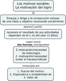 Este Cmap, tiene información relacionada con: Psicología. Motivación. Motivos sociales motivación del logro, Los motivos sociales: La motivación del logro es Empuja y dirige a la consecución exitosa de una meta u objetivo reconocido socialmente, Empuja y dirige a la consecución exitosa de una meta u objetivo reconocido socialmente aparece cuando reconoce el resultado de sus actividades dependen de él y no del azar (3 años), 1.motivación/necesidad de éxito/logro 2. motivación/necesidad evitar el fracaso/ridículo compuesta por 1. Fuerza del motivo 2. Expectativa o probabilidad de 3. Valor de, reconoce el resultado de sus actividades dependen de él y no del azar (3 años) según teoría dos fuerzas contrapuestas 1.motivación/necesidad de éxito/logro 2. motivación/necesidad evitar el fracaso/ridículo