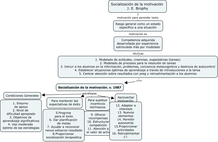 Este Cmap, tiene información relacionada con: Psicología. Motivación. 6.1 Socialización de la motivación de J.E. Brophy, Para sustituir incentivos intrínsecos ???? 9. Ofrecer recompensas 10. Estructurar competición 11. Atención a el valor de activ, Rasgo general como un estado específico a una situación motivación es Competencia adquirida desarrollada por experiencia estimulada más por modelado, Para mantener las expectativas de éxito estrategías expectativa-valor 5.Progrma para el éxito 6. Dar planificación de metas 7. Ayudar a reconocer nexos esfuerzo-resultado 8.Proporcionar socialización terapeútica, Socializaicón de la motivación. v. 1987 estrategias Aprovechar motivación intrínseca, 1. Modelado de actitudes, creencias, expectativas (tareas) 2. Modelado de procesos para la resoluión de tareas 3. Intruir a los alumnos en la información, problemas, conciencia metacognitiva y destreza de autocontrol 4. Establecer situaciones óptimas de aprendizaje a través de introducciones a la tarea 5. Centrar atención sobre resultados con preg y retroalimentación a los alumnos ???? Socializaicón de la motivación. v. 1987, Socialización de la motivación J. E. Brophy motivación para aprender tanto Rasgo general como un estado específico a una situación, Socializaicón de la motivación. v. 1987 estrategias Para mantener las expectativas de éxito, Aprovechar motivación intrínseca ???? 12. Adaptar a intereses 13. Nuevos elementos 14. Permitir autonomía 15.Proporcionar actividades 16. Retroalimentar 17., Socializaicón de la motivación. v. 1987 estrategias Condiciones Generales, Socializaicón de la motivación. v. 1987 estrategias Para sustituir incentivos intrínsecos, Competencia adquirida desarrollada por experiencia estimulada más por modelado técnicas 1. Modelado de actitudes, creencias, expectativas (tareas) 2. Modelado de procesos para la resoluión de tareas 3. Intruir a los alumnos en la información, problemas, conciencia metacognitiva y destreza de autocontrol 4. Establecer situaciones óptimas de aprendizaje a través de introducciones a la tarea 5. Centrar atención sobre resultados con preg y retroalimentación a los alumnos