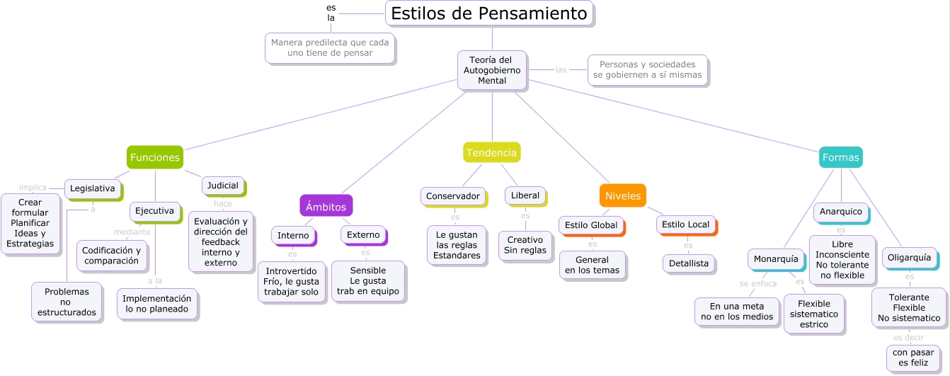 Este Cmap, tiene información relacionada con: 3. Los estilos de Pensamiento, Estilo Global es General en los temas, Teoría del Autogobierno Mental Funciones Legislativa, Teoría del Autogobierno Mental Funciones Judicial, Estilos de Pensamiento es la Manera predilecta que cada uno tiene de pensar, Oligarquía es Tolerante Flexible No sistematico, Teoría del Autogobierno Mental Tendencia Conservador, Legislativa a Problemas no estructurados, Teoría del Autogobierno Mental Niveles Estilo Global, Teoría del Autogobierno Mental Niveles Estilo Local, Estilo Local es Detallista, Teoría del Autogobierno Mental las Personas y sociedades se gobiernen a sí mismas, Monarquía se enfoca En una meta no en los medios, Interno es Introvertido Frío, le gusta trabajar solo, Teoría del Autogobierno Mental Formas Monarquía, Tolerante Flexible No sistematico es decir con pasar es feliz, Ejecutiva mediante Codificación y comparación, Externo es Sensible Le gusta trab en equipo, Teoría del Autogobierno Mental Ámbitos Interno, Anarquico Formas Monarquía, Teoría del Autogobierno Mental Funciones Ejecutiva