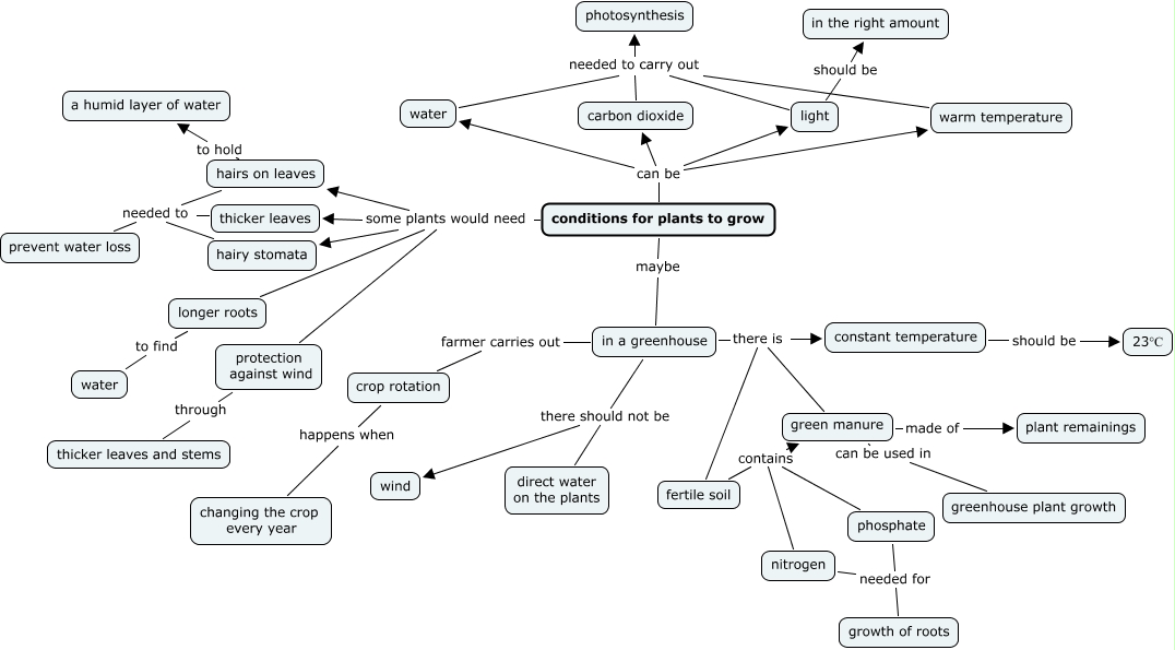 This Concept Map, created with IHMC CmapTools, has information related to: CHRISTINE POST, conditions for plants to grow some plants would need protection against wind, warm temperature needed to carry out photosynthesis, nitrogen needed for growth of roots, in a greenhouse there is constant temperature, carbon dioxide needed to carry out photosynthesis, thicker leaves needed to prevent water loss, longer roots to find water, conditions for plants to grow some plants would need hairy stomata, phosphate needed for growth of roots, water needed to carry out photosynthesis, hairs on leaves needed to prevent water loss, in a greenhouse there is fertile soil, conditions for plants to grow can be light, conditions for plants to grow some plants would need thicker leaves, light should be in the right amount, hairs on leaves to hold a humid layer of water, constant temperature should be 23°C, protection against wind through thicker leaves and stems, in a greenhouse there is green manure, fertile soil contains green manure