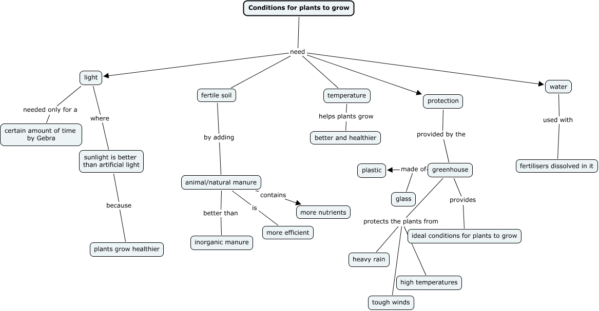 This Concept Map, created with IHMC CmapTools, has information related to: FAYE POST, greenhouse protects the plants from high temperatures, greenhouse protects the plants from tough winds, Conditions for plants to grow need light, Conditions for plants to grow need water, light where sunlight is better than artificial light, water used with fertilisers dissolved in it, Conditions for plants to grow need temperature, Conditions for plants to grow need fertile soil, light needed only for a certain amount of time by Gebra, protection provided by the greenhouse, animal/natural manure contains more nutrients, greenhouse provides ideal conditions for plants to grow, fertile soil by adding animal/natural manure, Conditions for plants to grow need protection, greenhouse made of plastic, animal/natural manure better than inorganic manure, animal/natural manure is more efficient, sunlight is better than artificial light because plants grow healthier, greenhouse made of glass, greenhouse protects the plants from heavy rain