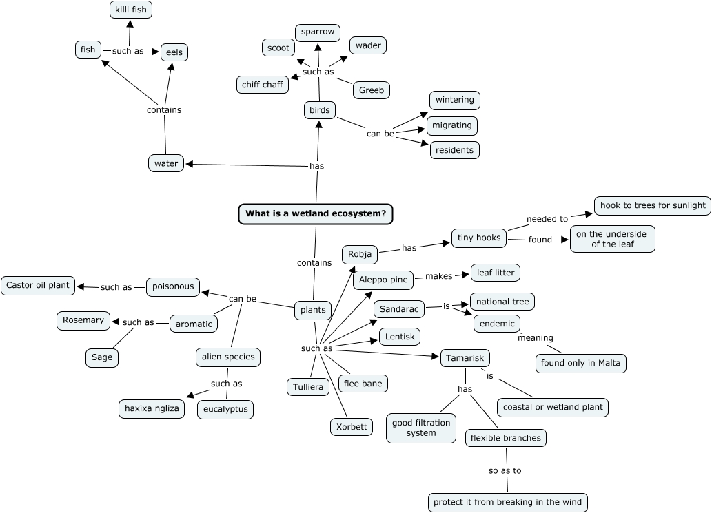 This Concept Map, created with IHMC CmapTools, has information related to: YASMIN POST, birds such as Greeb, birds such as wader, birds such as chiff chaff, birds can be migrating, birds can be residents, Sandarac is endemic, Tamarisk has flexible branches, fish such as eels, plants such as Robja, plants such as Tulliera, flexible branches so as to protect it from breaking in the wind, Robja has tiny hooks, water contains fish, Tamarisk has good filtration system, fish such as killi fish, birds such as sparrow, endemic meaning found only in Malta, Aleppo pine makes leaf litter, plants such as Xorbett, water contains eels