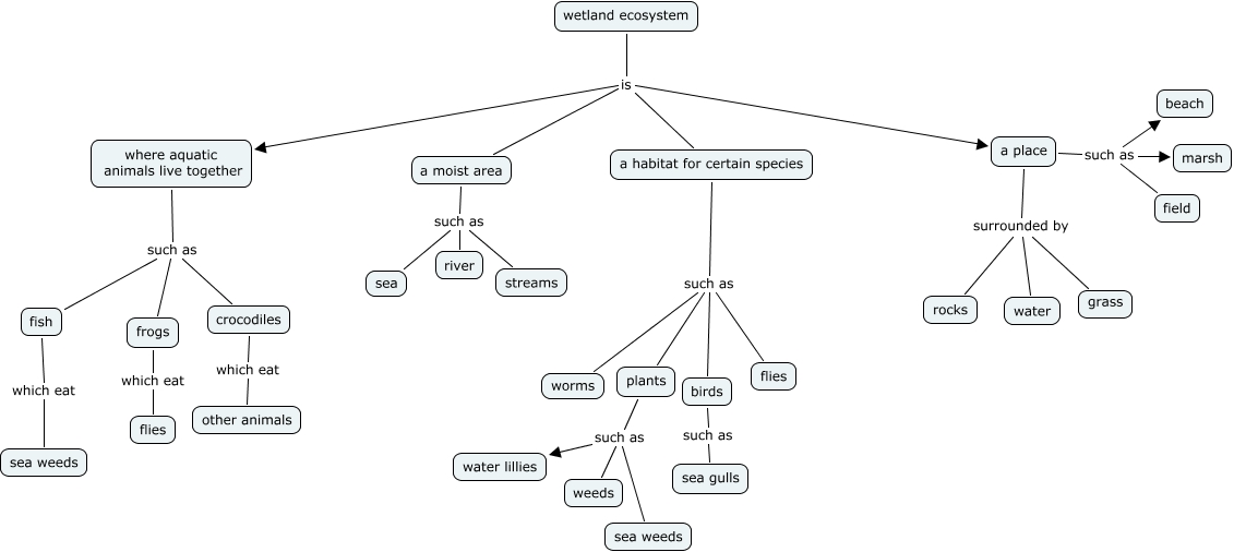 This Concept Map, created with IHMC CmapTools, has information related to: GRETA PRE, a place such as field, plants such as sea weeds, plants such as weeds, wetland ecosystem is where aquatic animals live together, crocodiles which eat other animals, where aquatic animals live together such as frogs, a habitat for certain species such as plants, birds such as sea gulls, fish which eat sea weeds, a habitat for certain species such as birds, a habitat for certain species such as worms, a moist area such as sea, a moist area such as streams, wetland ecosystem is a habitat for certain species, a place surrounded by water, where aquatic animals live together such as fish, a moist area such as river, a place such as beach, a habitat for certain species such as flies, a place such as marsh