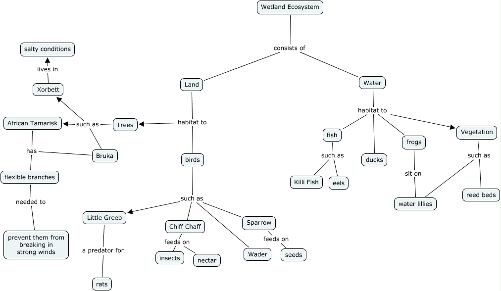 This Concept Map, created with IHMC CmapTools, has information related to: CHRISTINA POST, Wetland Ecosystem consists of Water, Bruka has flexible branches, Xorbett lives in salty conditions, Chiff Chaff feeds on nectar, Land habitat to birds, Vegetation such as water lillies, birds such as Little Greeb, frogs sit on water lillies, Trees such as Bruka, birds such as Wader, Water habitat to Vegetation, Vegetation such as reed beds, Chiff Chaff feeds on insects, Land habitat to Trees, birds such as Sparrow, fish such as Killi Fish, Sparrow feeds on seeds, Trees such as African Tamarisk, flexible branches needed to prevent them from breaking in strong winds, Water habitat to fish