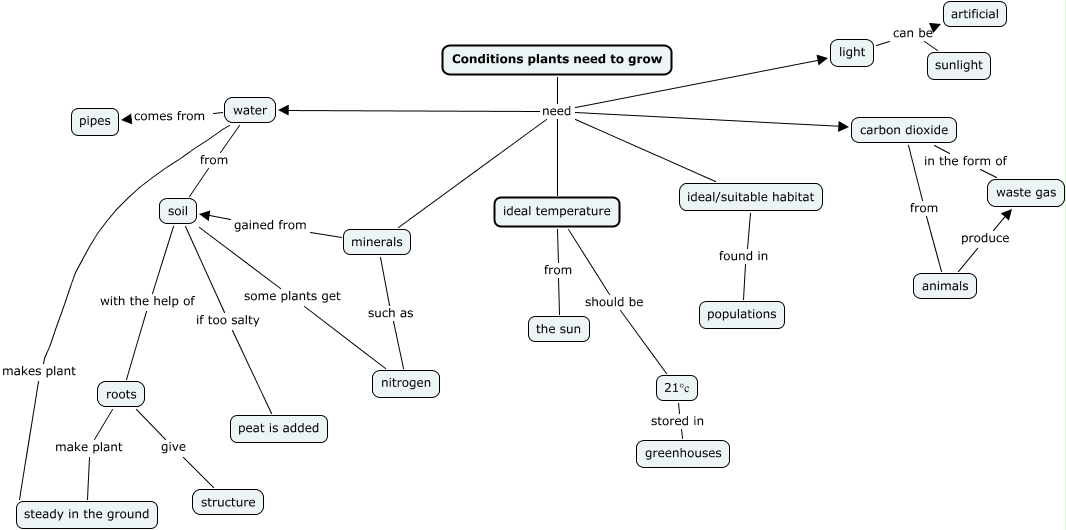 This Concept Map, created with IHMC CmapTools, has information related to: LINUS POST, minerals gained from soil, light can be sunlight, minerals such as nitrogen, Conditions plants need to grow need ideal/suitable habitat, ideal temperature should be 21°c, carbon dioxide in the form of waste gas, ideal/suitable habitat found in populations, 21°c stored in greenhouses, light can be artificial, roots make plant steady in the ground, soil if too salty peat is added, soil some plants get nitrogen, water comes from pipes, water from soil, Conditions plants need to grow need light, soil with the help of roots, Conditions plants need to grow need water, roots give structure, Conditions plants need to grow need minerals, ideal temperature from the sun