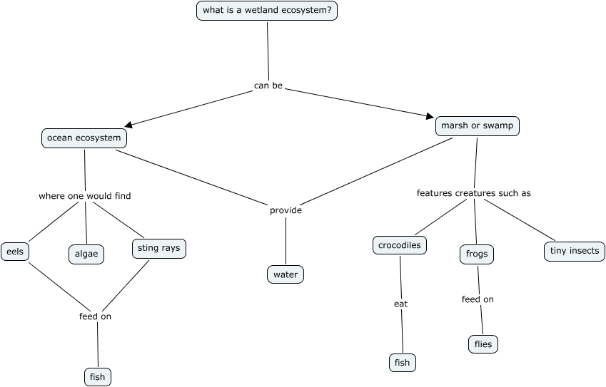 This Concept Map, created with IHMC CmapTools, has information related to: ALAIN PRE, ocean ecosystem where one would find algae, eels feed on fish, ocean ecosystem provide water, marsh or swamp features creatures such as tiny insects, ocean ecosystem where one would find eels, sting rays feed on fish, crocodiles eat fish, what is a wetland ecosystem? can be ocean ecosystem, marsh or swamp features creatures such as crocodiles, marsh or swamp provide water, what is a wetland ecosystem? can be marsh or swamp, marsh or swamp features creatures such as frogs, frogs feed on flies, ocean ecosystem where one would find sting rays