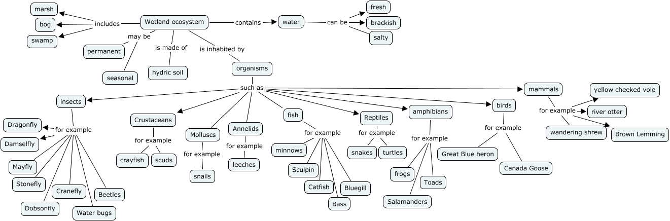 This Concept Map, created with IHMC CmapTools, has information related to: ANTONIA POST, amphibians for example Toads, insects for example Dobsonfly, insects for example Mayfly, Reptiles for example snakes, birds for example Great Blue heron, fish for example minnows, Wetland ecosystem contains water, organisms such as amphibians, insects for example Beetles, Annelids for example leeches, fish for example Catfish, water can be fresh, organisms such as Crustaceans, insects for example Damselfly, organisms such as insects, insects for example Water bugs, organisms such as birds, Wetland ecosystem includes swamp, mammals for example yellow cheeked vole, mammals for example Brown Lemming