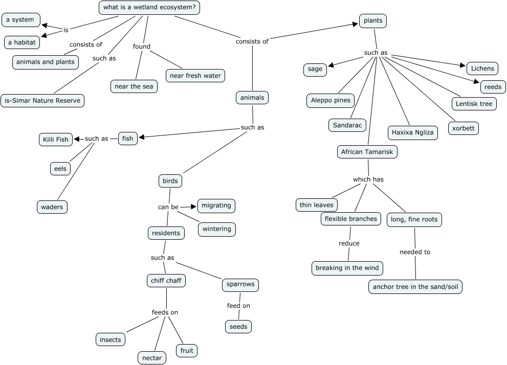 This Concept Map, created with IHMC CmapTools, has information related to: SVETLANA POST, plants such as xorbett, plants such as Sandarac, plants such as reeds, fish such as waders, what is a wetland ecosystem? consists of animals, chiff chaff feeds on fruit, residents such as sparrows, what is a wetland ecosystem? found near the sea, plants such as sage, chiff chaff feeds on insects, African Tamarisk which has flexible branches, sparrows feed on seeds, what is a wetland ecosystem? is a system, chiff chaff feeds on nectar, plants such as Aleppo pines, flexible branches reduce breaking in the wind, African Tamarisk which has long, fine roots, what is a wetland ecosystem? is a habitat, long, fine roots needed to anchor tree in the sand/soil, residents such as chiff chaff