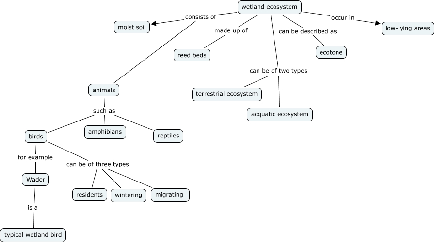 This Concept Map, created with IHMC CmapTools, has information related to: KRISTINA BUH POST, wetland ecosystem consists of moist soil, wetland ecosystem made up of reed beds, Wader is a typical wetland bird, wetland ecosystem can be described as ecotone, wetland ecosystem can be of two types terrestrial ecosystem, wetland ecosystem occur in low-lying areas, animals such as birds, animals such as amphibians, birds can be of three types residents, birds can be of three types migrating, animals such as reptiles, wetland ecosystem consists of animals, birds can be of three types wintering, birds for example Wader, wetland ecosystem can be of two types acquatic ecosystem