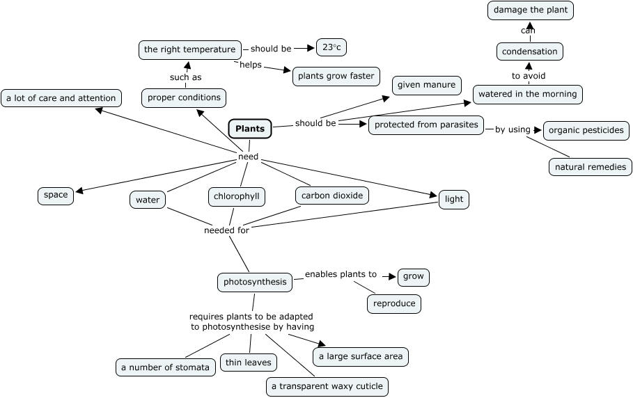 This Concept Map, created with IHMC CmapTools, has information related to: AMANDA POST, Plants need space, photosynthesis requires plants to be adapted to photosynthesise by having a transparent waxy cuticle, watered in the morning to avoid condensation, carbon dioxide needed for photosynthesis, protected from parasites by using organic pesticides, protected from parasites by using natural remedies, water needed for photosynthesis, photosynthesis requires plants to be adapted to photosynthesise by having a number of stomata, the right temperature should be 23°c, Plants should be watered in the morning, the right temperature helps plants grow faster, Plants should be given manure, condensation can damage the plant, Plants need light, Plants need chlorophyll, photosynthesis requires plants to be adapted to photosynthesise by having thin leaves, Plants need water, photosynthesis enables plants to grow, light needed for photosynthesis, chlorophyll needed for photosynthesis