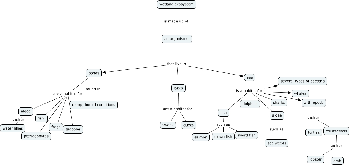 This Concept Map, created with IHMC CmapTools, has information related to: LUISA PRE, sea is a habitat for fish, all organisms that live in lakes, crustaceans such as lobster, lakes are a habitat for swans, fish such as clown fish, all organisms that live in sea, sea is a habitat for several types of bacteria, crustaceans such as crab, arthropods such as turtles, sea is a habitat for dolphins, ponds found in damp, humid conditions, ponds are a habitat for algae, ponds are a habitat for fish, sea is a habitat for whales, all organisms that live in ponds, wetland ecosystem is made up of all organisms, algae such as sea weeds, fish such as sword fish, ponds are a habitat for pteridophytes, sea is a habitat for algae