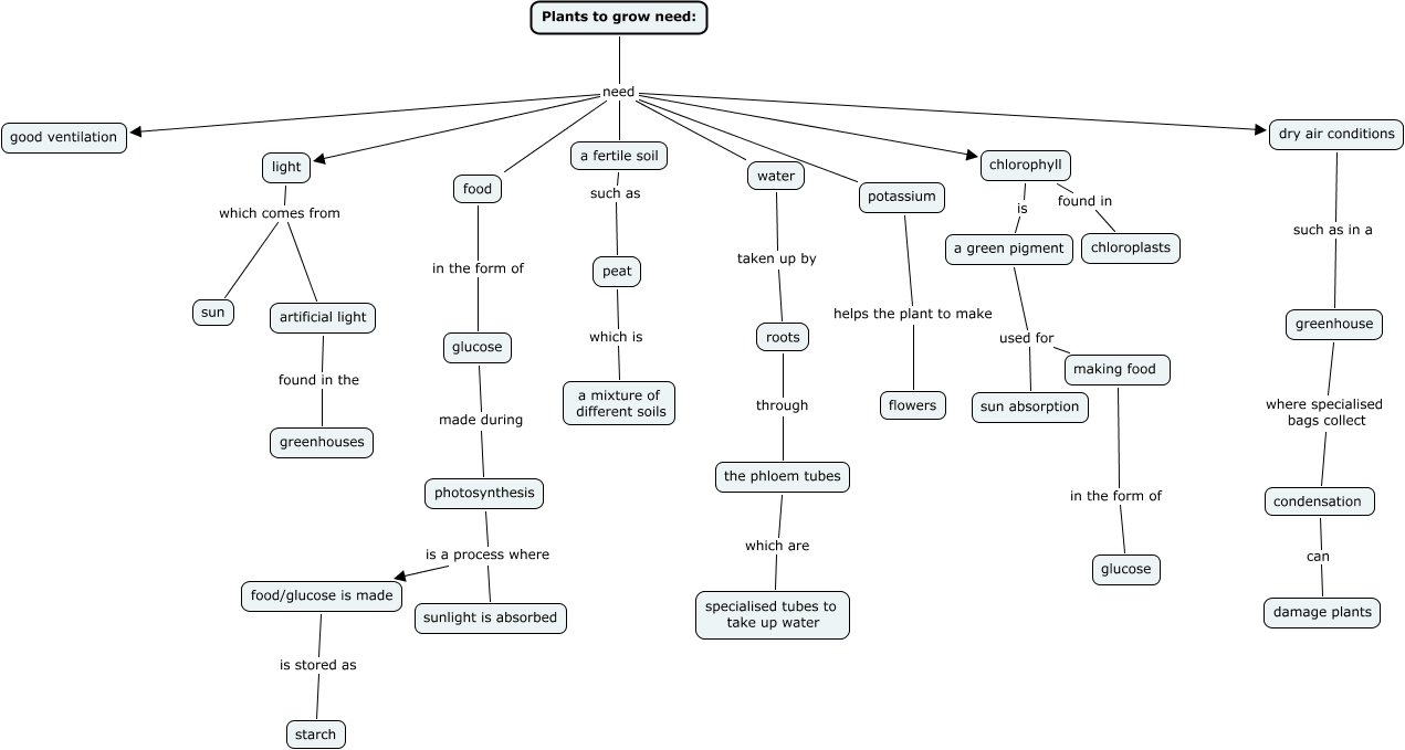 This Concept Map, created with IHMC CmapTools, has information related to: NICOLE C POST, food in the form of glucose, potassium helps the plant to make flowers, dry air conditions such as in a greenhouse, condensation can damage plants, roots through the phloem tubes, artificial light found in the greenhouses, food/glucose is made is stored as starch, Plants to grow need: need water, Plants to grow need: need potassium, Plants to grow need: need food, peat which is a mixture of different soils, a fertile soil such as peat, light which comes from artificial light, the phloem tubes which are specialised tubes to take up water, photosynthesis is a process where food/glucose is made, light which comes from sun, making food in the form of glucose, photosynthesis is a process where sunlight is absorbed, glucose made during photosynthesis, chlorophyll is a green pigment