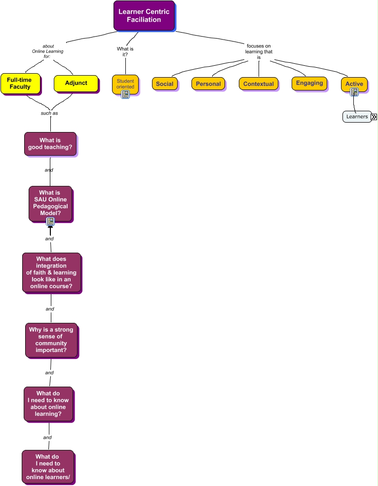 This Concept Map, created with IHMC CmapTools, has information related to: Learner Centered Faciliation, Learner Centric Faciliation about Online Learning for: Adjunct, Learner Centric Faciliation focuses on learning that is Personal, Active Learners can: work to on real world problems, Learner Centric Faciliation focuses on learning that is Contextual, Active Learners can: interact with information and people outside of class, What do I need to know about online learning? and What do I need to know about online learners/, Active Learners can: solve real world problems, research, make inquiries, etc., Active Learners can: work on group projects, Learner Centric Faciliation focuses on learning that is Active, Adjunct such as What is good teaching?, Learner Centric Faciliation focuses on learning that is Social, Active Learners can: contribute to learning when prompted through discusssion board, Learner Centric Faciliation about Online Learning for: Full-time Faculty, Learner Centric Faciliation focuses on learning that is Engaging, What is good teaching? and What is SAU Online Pedagogical Model?, Full-time Faculty such as What is good teaching?, What does integration of faith & learning look like in an online course? and Why is a strong sense of community important?, Learner Centric Faciliation What is it? Student oriented, Why is a strong sense of community important? and What do I need to know about online learning?, What is SAU Online Pedagogical Model? and What does integration of faith & learning look like in an online course?