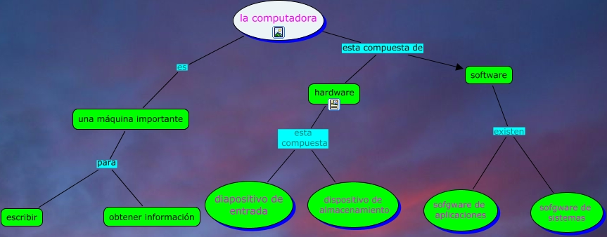 Este Cmap, tiene información relacionada con: la computadora, la computadora esta compuesta de software, hardware esta compuesta dispositivo de almacenamiento, una máquina importante para escribir, software existen sofgware de sistemas, la computadora es una máquina importante, la computadora esta compuesta de hardware, una máquina importante para obtener información, software existen sofgware de aplicaciones, hardware esta compuesta diapositivo de entrada