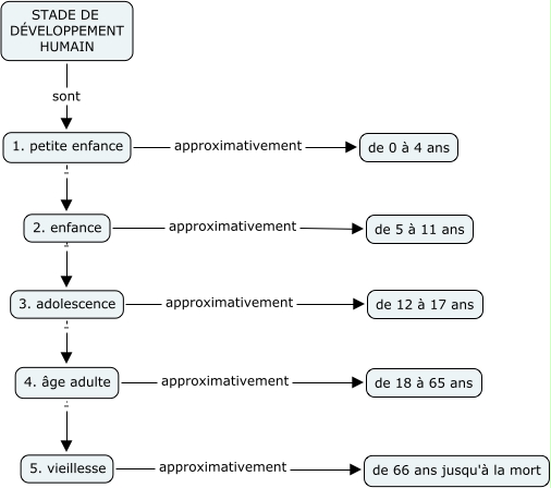 This Concept Map, created with IHMC CmapTools, has information related to: Stade du dév humain, 1. petite enfance . 2. enfance, 3. adolescence approximativement de 12 à 17 ans, 2. enfance approximativement de 5 à 11 ans, STADE DE DÉVELOPPEMENT HUMAIN sont 1. petite enfance, 3. adolescence . 4. âge adulte, 5. vieillesse approximativement de 66 ans jusqu'à la mort, 1. petite enfance approximativement de 0 à 4 ans, 4. âge adulte approximativement de 18 à 65 ans, 2. enfance . 3. adolescence, 4. âge adulte . 5. vieillesse