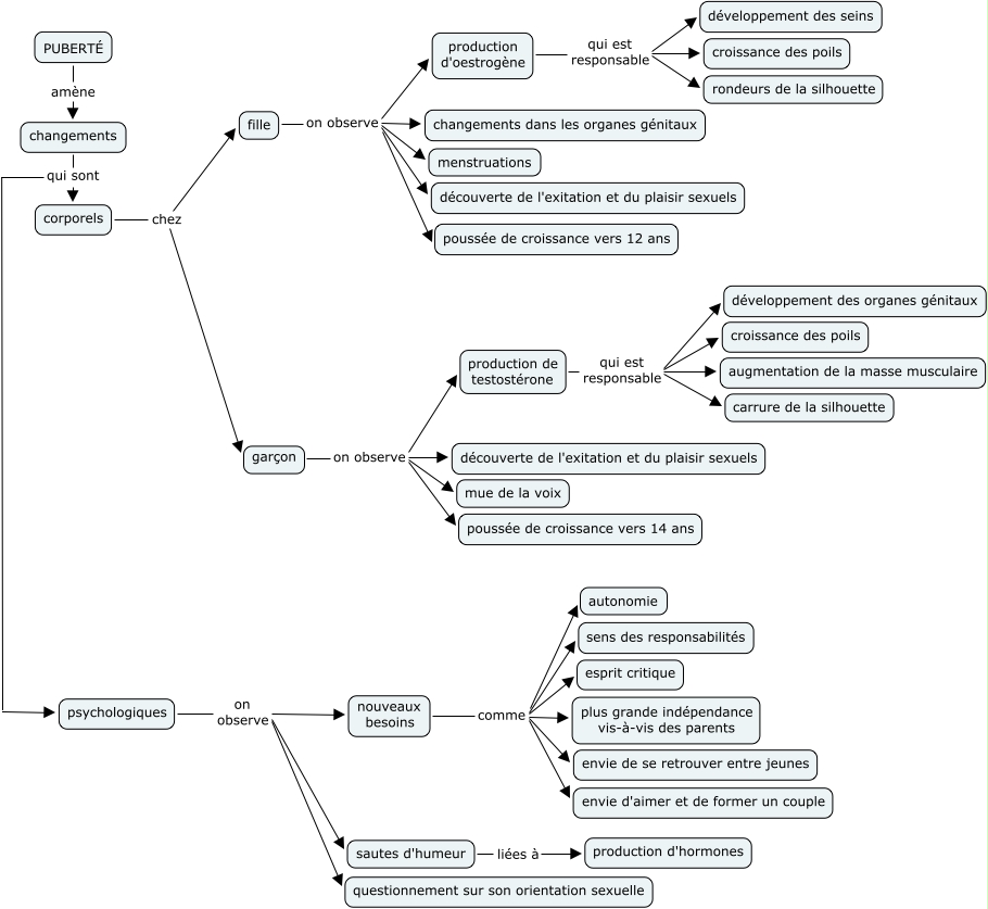 This Concept Map, created with IHMC CmapTools, has information related to: Puberté, sautes d'humeur liées à production d'hormones, psychologiques on observe questionnement sur son orientation sexuelle, garçon on observe poussée de croissance vers 14 ans, fille on observe menstruations, nouveaux besoins comme envie de se retrouver entre jeunes, garçon on observe production de testostérone, changements qui sont psychologiques, production d'oestrogène qui est responsable croissance des poils, production d'oestrogène qui est responsable rondeurs de la silhouette, corporels chez garçon, garçon on observe mue de la voix, corporels chez fille, nouveaux besoins comme autonomie, PUBERTÉ amène changements, nouveaux besoins comme envie d'aimer et de former un couple, production de testostérone qui est responsable carrure de la silhouette, psychologiques on observe sautes d'humeur, garçon on observe découverte de l'exitation et du plaisir sexuels, nouveaux besoins comme plus grande indépendance vis-à-vis des parents, production de testostérone qui est responsable développement des organes génitaux