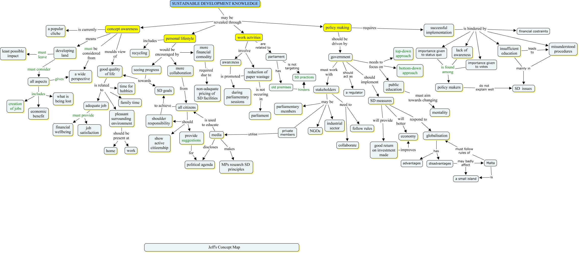 This Concept Map, created with IHMC CmapTools, has information related to: Jeff_revised_policy making_J, successful implementation is hindered by importance given to votes, misunderstood procedures mainly in SD issues, government should implement SD measures, all aspects gives a wide perspective, policy making requires successful implementation, globalisation has advantages, stakeholders may be NGOs, SD measures will better economy, pleasant surrounding environment should be present at home, successful implementation is hindered by insufficient education, pleasant surrounding environment should be present at work, stakeholders may be private members, stakeholders may be parliamentary members, good quality of life is related to adequate job, SUSTAINABLE DEVELOPMENT KNOWLEDGE may be revealed through work actvities, good return on investment made improves economy, developing land must consider all aspects, importance given to status quo is found among policy makers, all aspects includes creation of jobs, stakeholders need to follow rules