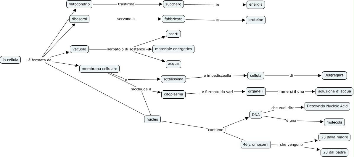 Questa Cmap, creata con IHMC CmapTools, contiene informazioni relative a: la cellula, nucleo contiene il 46 cromosomi, DNA che vuol dire Deoxyrido Nucleic Acid, DNA è una molecola, membrana cellulare racchiude il nucleo, membrana cellulare racchiude il citoplasma, 46 cromosomi che vengono 23 dalla madre, vacuolo serbatoio di sostanze acqua, la cellula è formata da vacuolo, membrana cellulare è sottilissima, mitocondrio trasfirma zucchero, ribosomi servono a fabbricare, citoplasma è formato da vari organelli, vacuolo serbatoio di sostanze materiale energetico, fabbricare le proteine, la cellula è formata da ribosomi, cellula di Disgregarsi, la cellula è formata da mitocondrio, nucleo contiene il DNA, vacuolo serbatoio di sostanze scarti, 46 cromosomi che vengono 23 dal padre